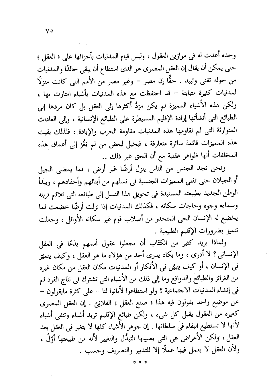 ولماذا يريد كثير من الكتّاب أن يجعلوا عقول أممهم بدْعًا في العقل الإنساني؟ لا أدري، وما يكاد يدري أحد من هؤلاء ما هو العقل، وكيف يتميّز في الإنسان، أو كيف يتبيَّن في الأفكار أو المدنيات مكان العقل من مكان غيره من الغرائز والطبائع والدوافع وما إلى ذلك من الأشياء التي تشترك في نتاج الفرد ثم في إنشاء المدنيات الاجتماعية؟ ولو استطاعوا لأبانوا لنا -على كثرة ما يقولون- عن موضع واحد يقولون فيه هذا "صنع العقل" الفلانِيّ. إن العقل المصري كغيره من العقول يقبل كل شيء، ولكن طبائع الإقليم تريد أشياء وتنفي أشياء لأنها لا تستطيع البقاء في سلطانها. إن جوهر الأشياء كلها لا يتغير في العقل بعد العقل، ولكن الأعراض هي التي يصيبها التبدُّل والتغيير لأنه من طبيعتها أوّلُ، ولأن العقل لا يعمل فيها عملًا إلا للتدبير والتصريف وحسب.