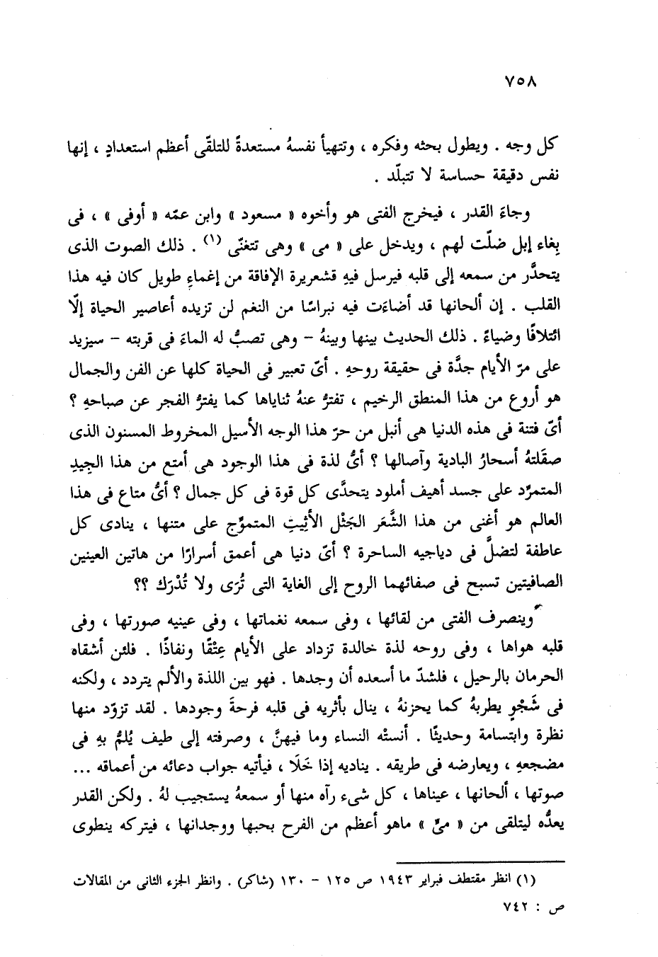 وجاءَ القدر، فيخرج الفتى هو وأخوه "مسعود" وابن عمّه "أوفى"، في بِغاء إبل ضلت لهم، ويدخل على "مى" وهي تتغنّى (¬1). ذلك الصوت الذي يتحدر من سمعه إلى قلبه فيرسل فيهِ قشعريرة الإفاقة من إغماءِ طويل كان فيه هذا القلب. إن ألحانها قد أضاءَت فيه نبراسًا من النغم لن تزيده أعاصير الحياة إلَّا ائتلافًا وضياءً. ذلك الحديث بينها وبينهُ -وهي تصب له الماءَ في قربته- سيزيد على مرّ الأيام جدَّة في حقيقة روحهِ. أيُّ تعبير في الحياة كلها عن الفن والجمال هو أروع من هذا المنطق الرخيم، تفترُّ عنهُ ثناياها كما يفترُّ الفجر عن صباحهِ؟ أيّ فتنة في هذه الدنيا هي أنبل من حرّ هذا الوجه الأسيل المخروط المسنون الذي صقَلتهُ أسحارُ البادية وآصالها؟ أيُّ لذة في هذا الوجود هي أمتع من هذا الجِيدِ المتمرّد على جسد أهيف أملود يتحدَّى كل قوة في كل جمال؟ أيُّ متاع في هذا العالم هو أغنى من هذا الشَّعَر الجَثل الأثِيتِ المتموج على متنها، ينادى كل عاطفة لتضل في دياجيه الساحرة؟ أيُّ دنيا هي أعمق أسرارًا من هاتين العينين الصافيتين تسبح في صفائهما الروح إلى الغاية التي تُرَى ولا تُدرَك؟ ؟