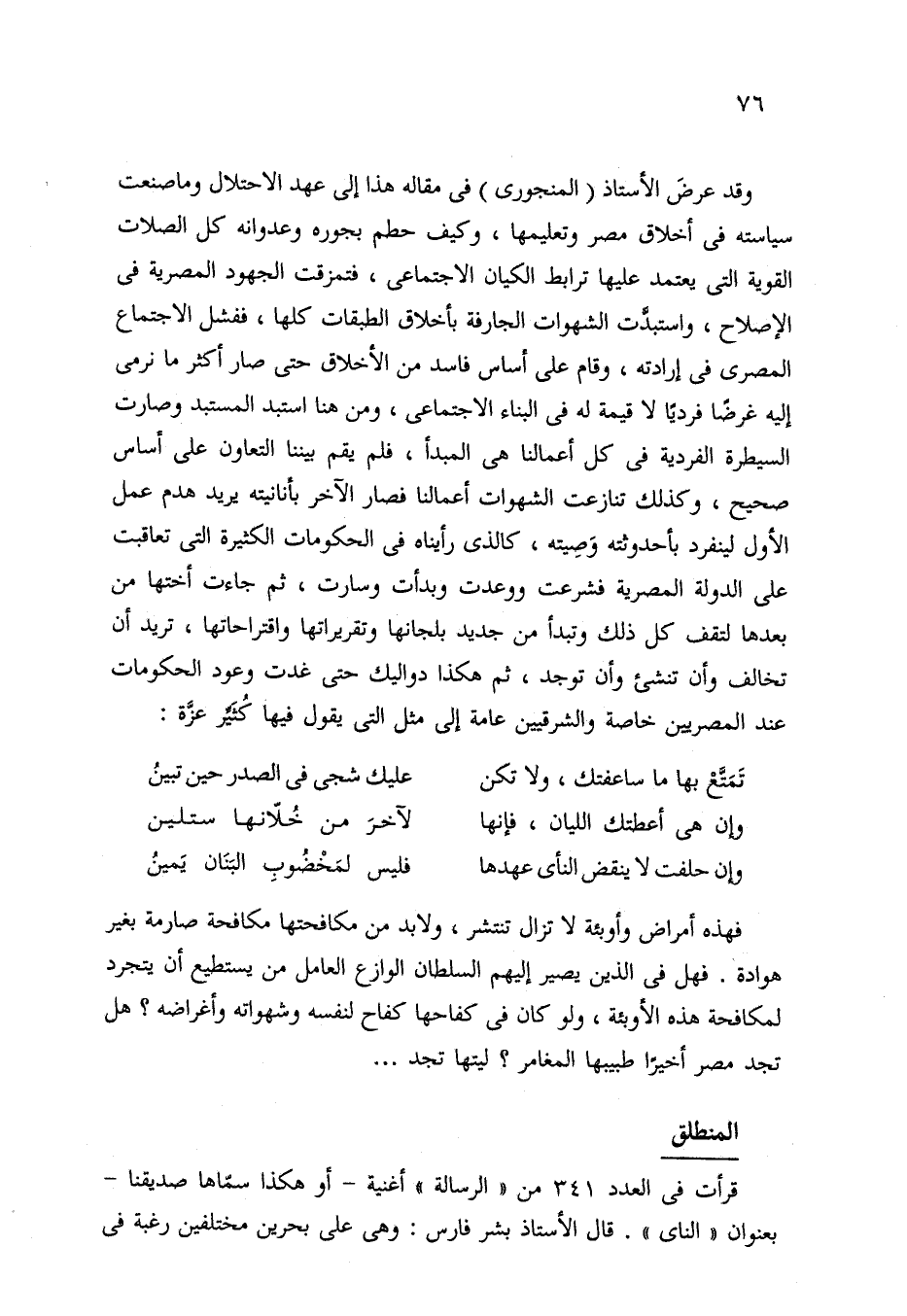 وقد عرضَ الأستاذ (المنجوري) في مقاله هذا إلى عهد الاحتلال وما صنعت سياسته في أخلاق مصر وتعليمها، وكيف حطم بجوره وعدوانه كل الصلات القوية التي يعتمد عليها ترابط الكيان الاجتماعي، فتمزقت الجهرد المصرية في الإصلاح، واستبدَّت الشهوات الجارفة بأخلاق الطبقات كلها، ففشل الاجتماع المصري في إرادته، وقام على أساس فاسد من الأخلاق حتى صار أكثر ما نرمي إليه غرضًا فرديًا لا قيمة له في البناء الاجتماعي، ومن هنا استبد المستبد وصارت السيطرة الفردية في كل أعمالنا هي المبدأ، فلم يقم بيننا التعاون على أساس صحيح، وكذلك تنازعت الشهوات أعمالنا فصار الآخر بأنانيته يريد هدم عمل الأول لينفرد بأحدوثته وَصِيته، كالذي رأيناه في الحكومات الكثيرة التي تعاقبت على الدولة المصرية فشرعت ووعدت وبدأت وسارت، ثم جاءت أختها من بعدها لتقف كل ذلك وتبدأ من جديد بلجانها وتقريراتها واقتراحاتها، تريد أن تخالف وأن تنشئ وأن توجد، ثم هكذا دواليك حتى غدت وعود الحكومات عند المصريين خاصة والشرقيين عامة إلى مثل التي يقول فيها كُثَيِّر عزَّة:
