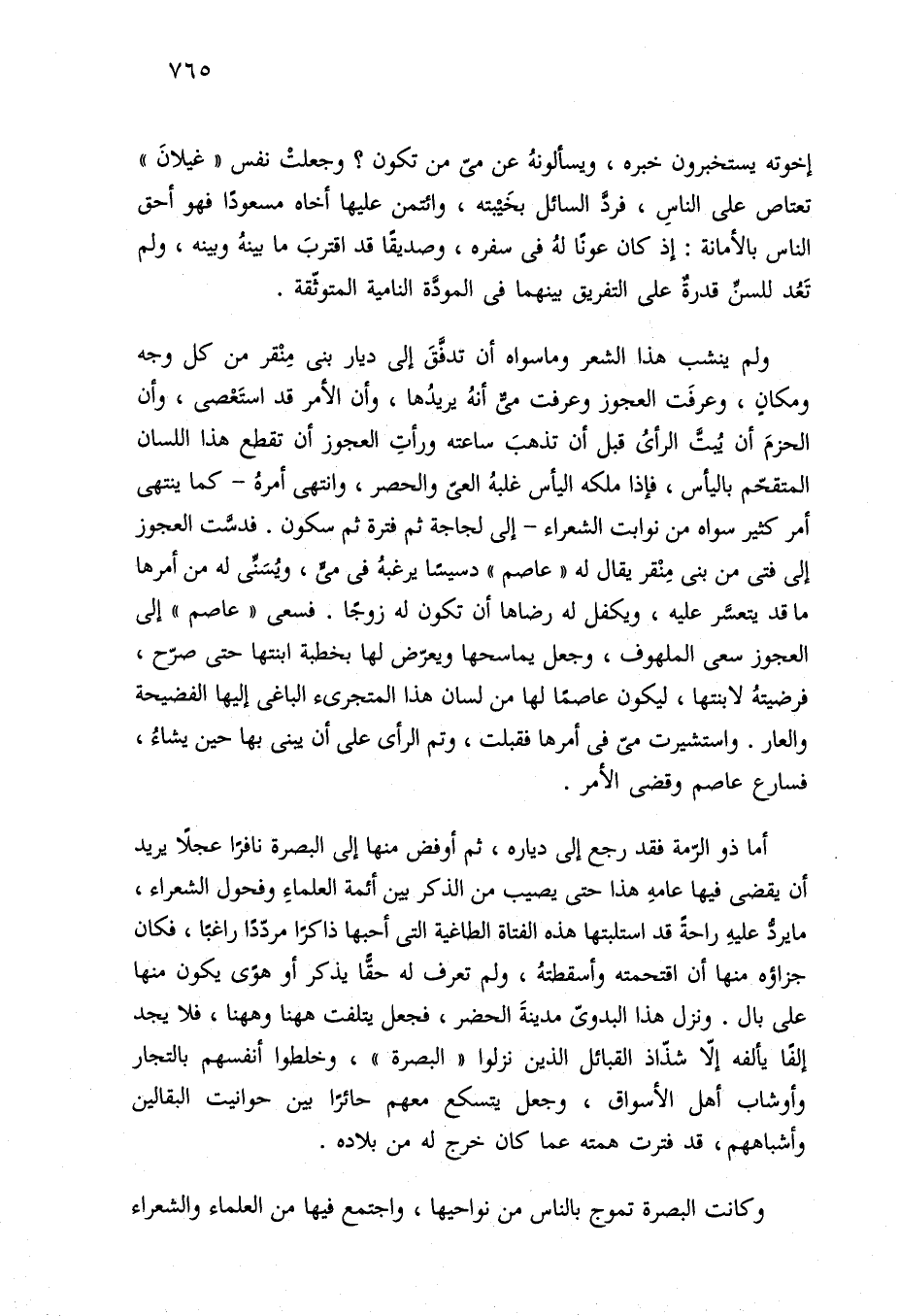 أما ذو الرّمة فقد رجع إلى دياره، ثم أوفض منها إلى البصرة نافرًا عجلًا يريد أن يقضى فيها عامهِ هذا حتى يصيب من الذكر بين أئمة العلماءِ وفحول الشعراء، ما يردُّ عليهِ راحةً قد استلبتها هذه الفتاة الطاغية التي أحبها ذاكرًا مردّدًا راغبًا، فكان جزاؤه منها أن اقتحمته وأسقطتهُ، ولم تعرف له حقًّا يذكر أو هوًى يكون منها على بال. ونزل هذا البدويّ مدينةَ الحضر، فجعل يتلفت ههنا وههنا، فلا يجد إلفًا يألفه إلّا شذّاذ القبائل الذين نزلوا "البصرة"، وخلطوا أنفسهم بالتجار وأوشاب أهل الأسواق، وجعل يتسكع معهم حائرًا بين حوانيت البقالين وأشباههم، قد فترت همته عما كان خرج له من بلاده.