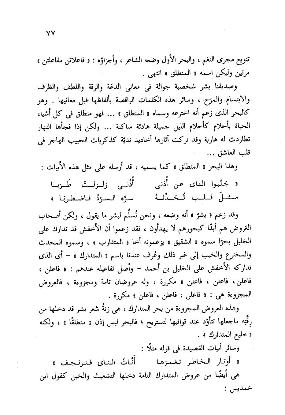 تنويع مجرى النغم، والبحر الأول وضعه الشاعر، وأجزاؤه: "فاعلاتن مفاعلتن" مرتين وليكن اسمه "المنطلق" انتهى.
