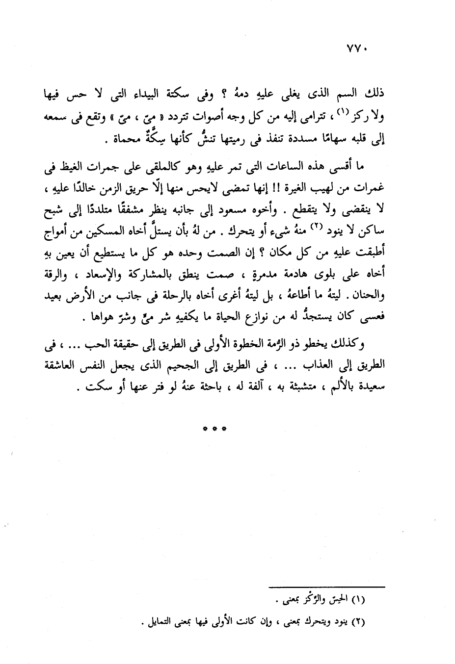 ما أقسى هذه الساعات التي تمر عليهِ وهو كالملقى على جمرات الغيظ في غمرات من لهيب الغيرة! ! إنها تمضي لا يحس منها إلا حريق الزمن خالدًا عليهِ، لا ينقضى ولا يتقطع. وأخوه مسعود إلى جانبه ينظر مشفقًا متلددًا إلى شبح ساكن لا ينود (¬2) منهُ شيء أو يتحرك. من لهُ بأن يستلَّ أخاه المسكين من أمواج أطبقت عليهِ من كل مكان؟ إن الصمت وحده هو كل ما يستطيع أن يعين بهِ أخاه على بلوى هادمة مدمرةٍ، صمت ينطق بالمشاركة والإسعاد، والرقة والحنان. ليتهُ ما أطاعهُ، بل ليتهُ أغرى أخاه بالرحلة في جانب من الأرض بعيد فعسى كان يستجدُّ له من نوازع الحياة ما يكفيهِ شر مىٍّ وشرّ هواها.