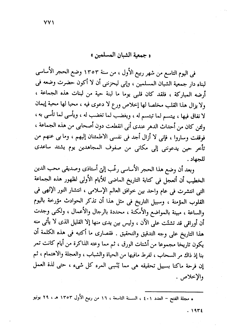 في اليوم التاسع من شهر ربيع الأول، من سنة 1353 وضع الحجر الأساسى لبناء دار جمعية الشبان المسلمين، وإني ليحزننى أن لا أكون حضرت وضعه في أرضه المباركة، فلقد كان قلبي يوما ما لبنة حية من لبنات هذه الجماعة، ولا يزال هذا القلب مخلصا لها إخلاص ورع لا دعوى فيه، محبا لها محبة إيمان لا نفاق فيها، يبتسم لما تبتسم له، ويغضب لما تغضب له، ويأسى لما تأسى به، ولئن كان من أحداث الدهر عندي أنى انقطعت دون أصحابى من هذه الجماعة، فوقفت وساروا، فإني لا أزال أجد في نفسي الاطمئنان إليهم، وما بى عنهم من تأخر حين يدعوننى إلى مكانى من صفوف المجاهدين يوم يشتد ساعدى للجهاد.