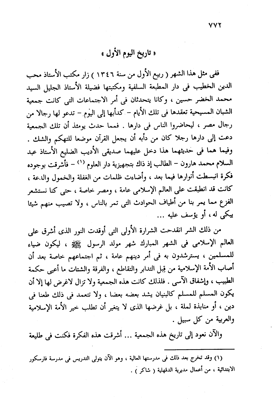 ففي مثل هذا الشهر (ربيع الأول من سنة 1346) زار مكتب الأستاذ محب الدين الخطيب في دار المطبعة السلفية ومكتبتها فضيلة الأستاذ الجليل السيد محمد الخضر حسين، وكانا يتحدثان في أمر الاجتماعات التي كانت جمعية الشبان المسيحية تعقدها في تلك الأيام -كدأبها إلى اليوم- تدعو لها رجالا من رجال مصر، ليحاضروا الناس في دارها. فمما حدث يومئذ أن تلك الجمعية دعت إلى دارها رجلا كان من دأبه أن يجعل القرآن موضعا للتهكم والشك. وفيما هما في حديثهما هذا دخل عليهما صديقي الأديب الضليع الأستاذ عبد السلام محمد هارون -الطالب إذ ذاك بتجهيزية دار العلوم (¬1) - فأشرقت بوجوده فكرة انبسطت أنوارها فيما بعد، وأضاءت ظلمات من الغفلة والخمول والدعة، كانت قد انطبقت على العالم الإسلامي عامة، ومصر خاصة، حتى كنا نستشعر الفزع مما يمر بنا من أطياف الحوادث التي تمر بالناس، ولا تصيب منهم شيئا يبكى له، أو يؤسف عليه. . .