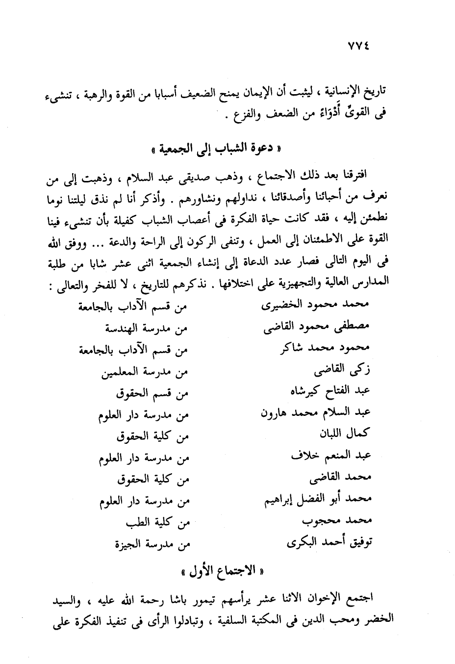 افترقنا بعد ذلك الاجتماع، وذهب صديقي عبد السلام، وذهبت إلى من نعرف من أحبائنا وأصدقائنا، نداولهم ونشاورهم. وأذكر أنا لم نذق ليلتنا نوما نطمئن إليه، فقد كانت حياة الفكرة في أعصاب الشباب كفيلة بأن تنشيء فينا القوة على الاطمئنان إلى العمل، وتنفي الركون إلى الراحة والدعة. . . ووفق الله في اليوم التالى فصار عدد الدعاة إلى إنشاء الجمعية اثنى عشر شابا من طلبة المدارس العالية والتجهيزية على اختلافها. نذكرهم للتاريخ، لا للفخر والتعالي: