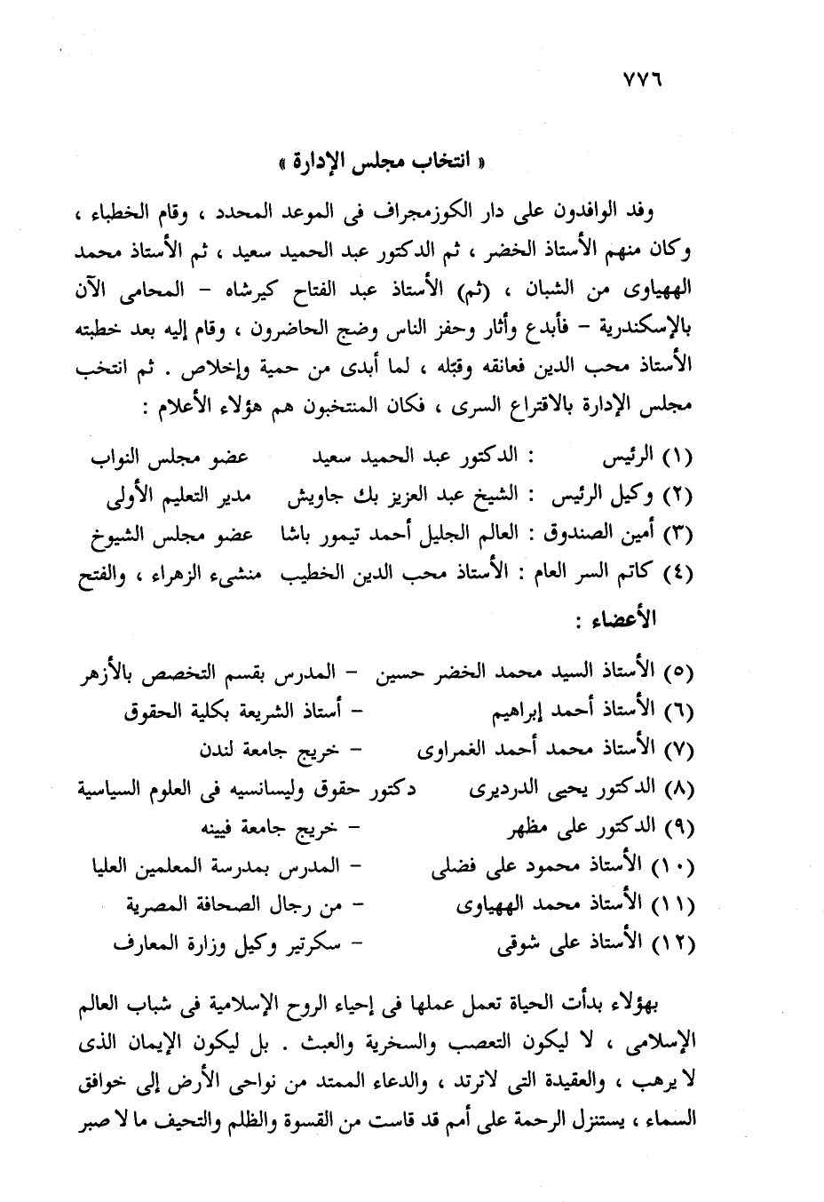 وفد الوافدون على دار الكوزمجراف في الموعد المحدد، وقام الخطباء، وكان منهم الأستاذ الخضر، ثم الدكتور عبد الحميد سعيد، ثم الأستاذ محمد الههياوى من الشبان، (ثم) الأستاذ عبد الفتاح كيرشاه -المحامى الآن بالإسكندرية- فأبدع وأثار وحفز الناس وضج الحاضرون، وقام إليه بعد خطبته الأستاذ محب الدين فعانقه وقبّله، لما أبدى من حمية وإخلاص. ثم انتخب مجلس الإدارة بالاقتراع السرى، فكان المنتخبون هم هؤلاء الأعلام: