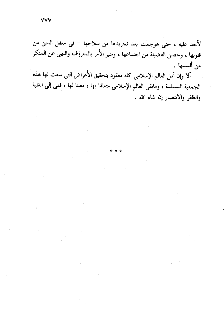 ألا وإن أمل العالم الإسلامي كله معقود بتحقيق الأغراض التي سعت لها هذه الجمعية المسلمة، وما بقي العالم الإسلامي متعلقا بها، معينا لها، فهي إلى الغلبة والظفر والانتصار إن شاء الله.