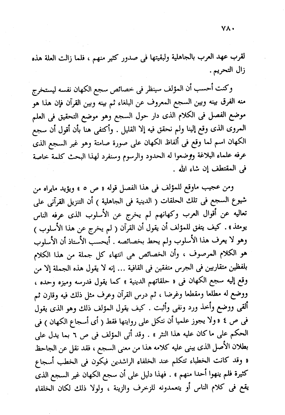 وكنت أحسب أن المؤلف سينظر في خصائص سجع الكهان نفسه ليستخرج منه الفرق بينه وبين السجع المعروف عن البلغاء ثم بينه وبين القرآن فإن هذا هو موضع الفصل في الكلام الذي دار حول السجع وهو موضع التحقيق في العلم المروي الذي وقع إلينا ولم نحقق فيه إلا القليل. وأكتفي هنا بأن أقول أن سجع الكهان اسم لما وقع في ألفاظ الكهان على صورة صامتة وهو غير السجع الذي عرفه علماء البلاغة ووضعوا له الحدود والرسوم وسنفرد لهذا البحث كلمة خاصة في المقتطف إن شاء الله.