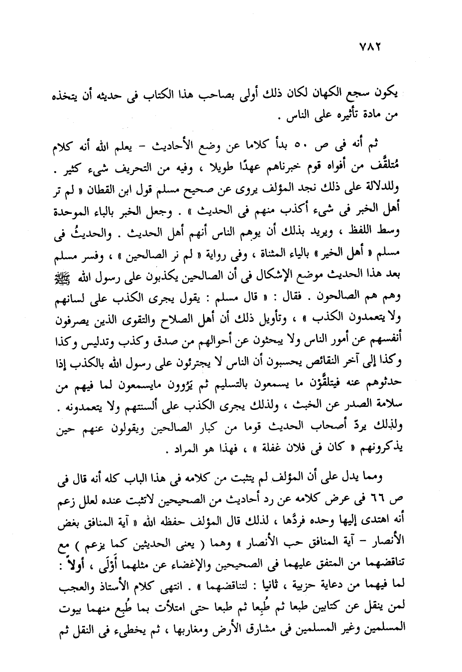ثم أنه في ص 50 بدأ كلاما عن وضع الأحاديث -يعلم الله أنه كلام مُتلقَّف من أفواه قوم خبرناهم عهدًا طويلا، وفيه من التحريف شيء كثير. وللدلالة على ذلك نجد المؤلف يروى عن صحيح مسلم قول ابن القطان "لم تر أهل الخبر في شيء أكذب منهم في الحديث". وجعل الخبر بالباء الموحدة وسط اللفظ، ويريد بذلك أن يوهم الناس أنهم أهل الحديث. والحديثُ في مسلم "أهل الخير" بالياء المثناة، وفي رواية "لم نر الصالحين"، وفسر مسلم بعد هذا الحديث موضع الإشكال في أن الصالحين يكذبون على رسول الله - صلى الله عليه وسلم - وهم هم الصالحون. فقال: "قال مسلم: يقول يجرى الكذب على لسانهم ولا يتعمدون الكذب"، وتأويل ذلك أن أهل الصلاح والتقوى الذين يصرفون أنفسهم عن أمور الناس ولا يبحثون عن أحوالهم من صدق وكذب وتدليس وكذا وكذا إلى آخر النقائص يحسبون أن الناس لا يجترئون على رسول الله بالكذب إذا حدثوهم عنه فيتلقَّوْن ما يسمعون بالتسليم ثم يَرُوون ما يسمعون لما فيهم من سلامة الصدر عن الخبث، ولذلك يجرى الكذب على ألسنتهم ولا يتعمدونه. ولذلك يردّ أصحاب الحديث قوما من كبار الصالحين ويقولون عنهم حين يذكرونهم "كان في فلان غفلة"، فهذا هو المراد.