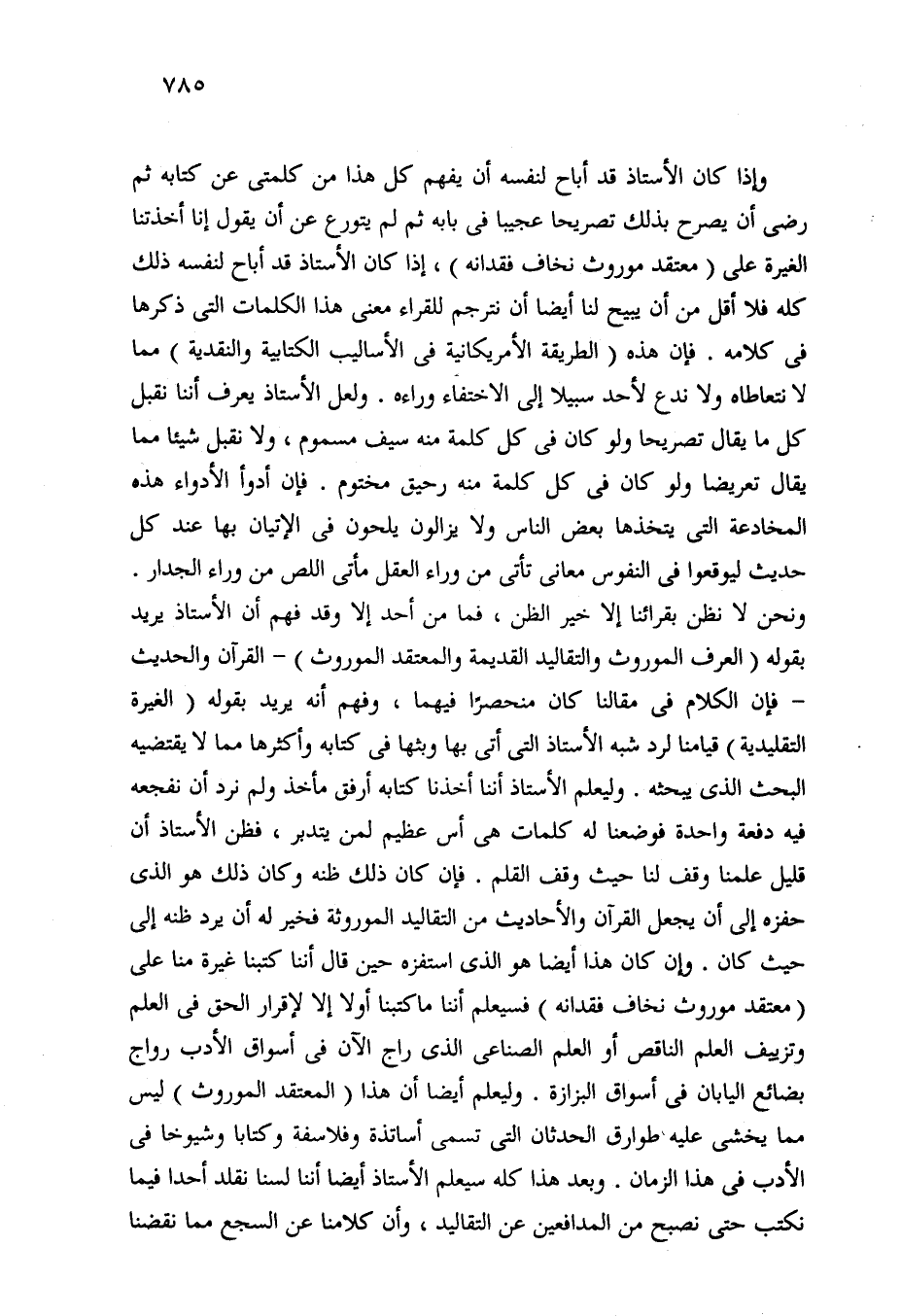 وإذا كان الأستاذ قد أباح لنفسه أن يفهم كل هذا من كلمتى عن كتابه ثم رضى أن يصرح بذلك تصريحا عجيبا في بابه ثم لم يتورع عن أن يقول إنا أخذتنا الغيرة على (معتقد موروث نخاف فقدانه)، إذا كان الأستاذ قد أباح لنفسه ذلك كله فلا أقل من أن يبيح لنا أيضا أن نترجم للقراء معنى هذه الكلمات التي ذكرها في كلامه. فإن هذه (الطريقة الأمريكانية في الأساليب الكتابية والنقدية) مما لا نتعاطاه ولا ندع لأحد سبيلا إلى الاختفاء وراءه. ولعل الأستاذ يعرف أننا نقبل كل ما يقال تصريحا ولو كان في كل كلمة منه سيف مسموم، ولا نقبل شيئا مما يقال تعريضا ولو كان في كل كلمة منه رحيق مختوم. فإن أدوأ الأدواء هذه المخادعة التي يتخذها بعض الناس ولا يزالون يلحون في الإتيان بها عند كل حديث ليوقعوا في النفوس معاني تأتي من وراء العقل مأتى اللص من وراء الجدار. ونحن لا نظن بقرائنا إلا خير الظن، فما من أحد إلا وقد فهم أن الأستاذ يريد بقوله (العرف الموروث والتقاليد القديمة والمعتقد الموروث) -القرآن والحديث- فإن الكلام في مقالنا كان منحصرًا فيهما، وفهم أنه يريد بقوله (الغيرة التقليدية) قيامنا لرد شبه الأستاذ التي أتى بها وبثها في كتابه وأكثرها مما لا يقتضيه البحث الذي يبحثه. وليعلم الأستاذ أننا أخذنا كتابه أرفق مأخذ ولم نرد أن نفجعه فيه دفعة واحدة فوضعنا له كلمات هي أس عظيم لمن يتدبر، فظن الأستاذ أن قليل علمنا وقف لنا حيث وقف القلم. فإن كان ذلك ظنه وكان ذلك هو الذي حفزه إلى أن يجعل القرآن والأحاديث من التقاليد الموروثة فخير له أن يرد ظنه إلى حيث كان. وإن كان هذا أيضا هو الذي استفزه حين قال أننا كتبنا غيرة منا على (معتقد موروث نخاف فقدانه) فسيعلم أننا ما كتبنا أولا إلا لإقرار الحق في العلم وتزييف العلم الناقص أو العلم الصناعى الذي راج الآن في أسواق الأدب رواج بضائع اليابان في أسواق البزازة. وليعلم أيضا أن هذا (المعتقد الموروث) ليس مما يخشى عليه طوارق الحدثان التي تسمى أساتذة وفلاسفة وكتابا وشيوخا في الأدب في هذا الزمان. وبعد هذا كله سيعلم الأستاذ أيضا أننا لسنا نقلد أحدا فيما نكتب حتى نصبح من المدافعين عن التقاليد، وأن كلامنا عن السجع مما نقضنا