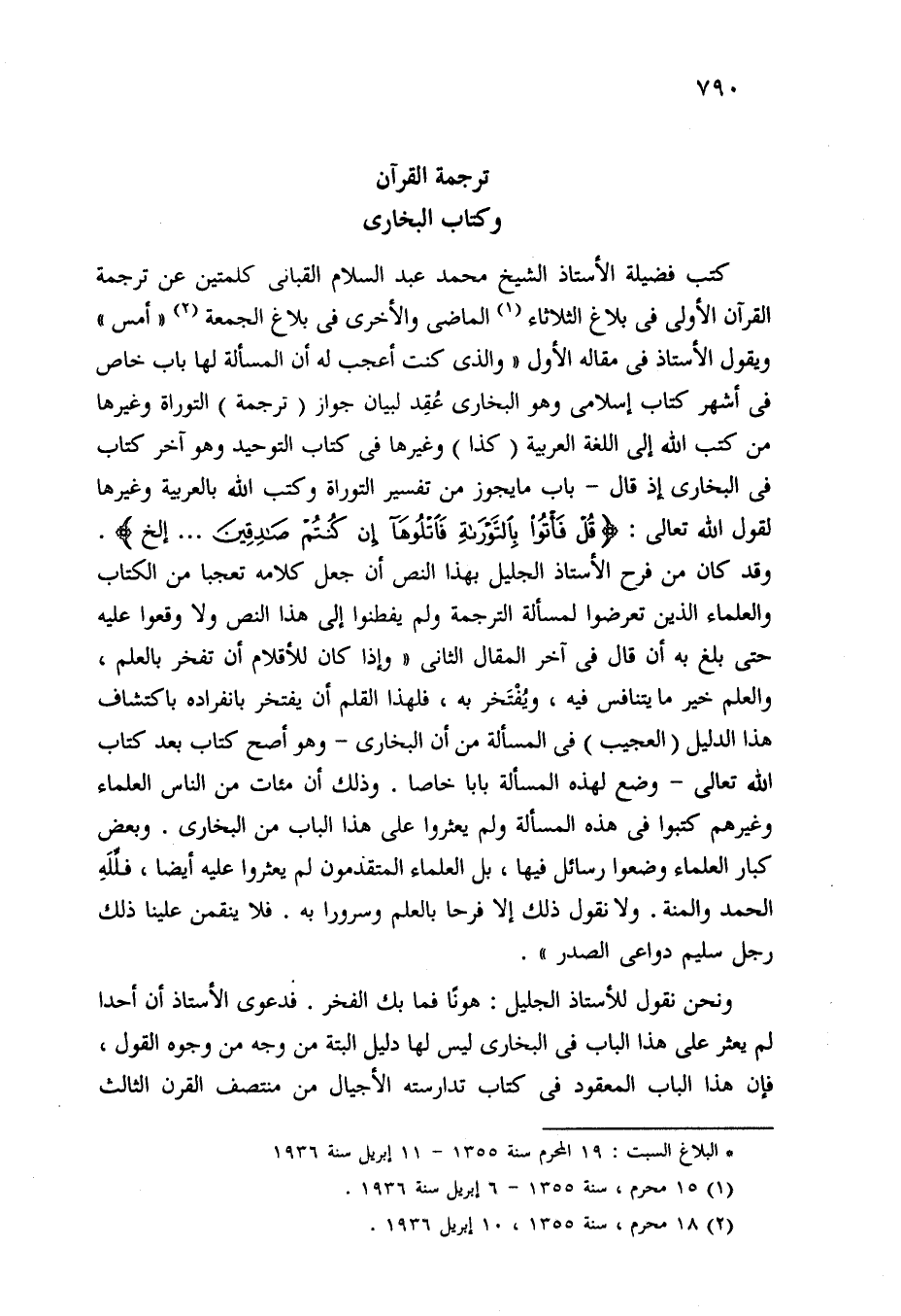 كتب فضيلة الأستاذ الشيخ محمد عبد السلام القبانى كلمتين عن ترجمة القرآن الأولى في بلاغ الثلاثاء (¬1) الماضي والأخرى في بلاغ الجمعة (¬2) "أمس" ويقول الأستاذ في مقاله الأول "والذي كنت أعجب له أن المسألة لها باب خاص في أشهر كتاب إسلامي وهو البخاري عُقِد لبيان جواز (ترجمة) التوراة وغيرها من كتب الله إلى اللغة العربية (كذا) وغيرها في كتاب التوحيد وهو آخر كتاب في البخاري إذ قال -باب ما يجوز من تفسير التوراة وكتب الله بالعربية وغيرها لقول الله تعالى: {قُلْ فَأْتُوا بِالتَّوْرَاةِ فَاتْلُوهَا إِنْ كُنْتُمْ صَادِقِينَ. . . إلخ}. وقد كان من فرح الأستاذ الجليل بهذا النص أن جعل كلامه تعجبا من الكتاب والعلماء الذين تعرضوا لمسألة الترجمة ولم يفطنوا إلى هذا النص ولا وقعوا عليه حتى بلغ به أن قال في آخر المقال الثاني "وإذا كان للأقلام أن تفخر بالعلم، والعلم خير ما يتنافس فيه، ويُفْتَخر به، فلهذا القلم أن يفتخر بانفراده باكتشاف هذا الدليل (العجيب) في المسألة من أن البخاري -وهو أصح كتاب بعد كتاب الله تعالى- وضع لهذه المسألة بابا خاصا. وذلك أن مئات من الناس العلماء وغيرهم كتبوا في هذه المسألة ولم يعثروا على هذا الباب من البخاري. وبعض كبار العلماء وضعوا رسائل فيها، بل العلماء المتقدمون لم يعثروا عليه أيضا، فللهِ الحمد والمنة. ولا نقول ذلك إلا فرحا بالعلم وسرورا به. فلا ينقمن علينا ذلك رجل سليم دواعى الصدر".
