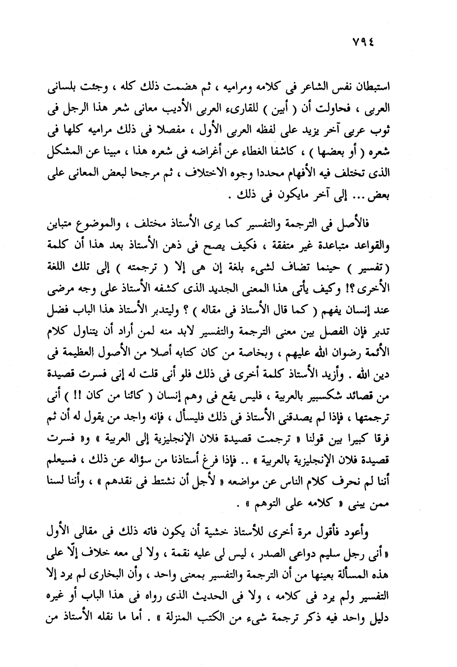 وأعود فأقول مرة أخرى للأستاذ خشية أن يكون فاته ذلك في مقالى الأول "أنى رجل سليم دواعى الصدر، ليس لي عليه نقمة، ولا لي معه خلاف إلا على هذه المسألة بعينها من أن الترجمة والتفسير بمعنى واحد، وأن البخاري لم يرد إلا التفسير ولم يرد في كلامه، ولا في الحديث الذي رواه في هذا الباب أو غيره دليل واحد فيه ذكر ترجمة شيء من الكتب المنزلة". أما ما نقله الأستاذ من