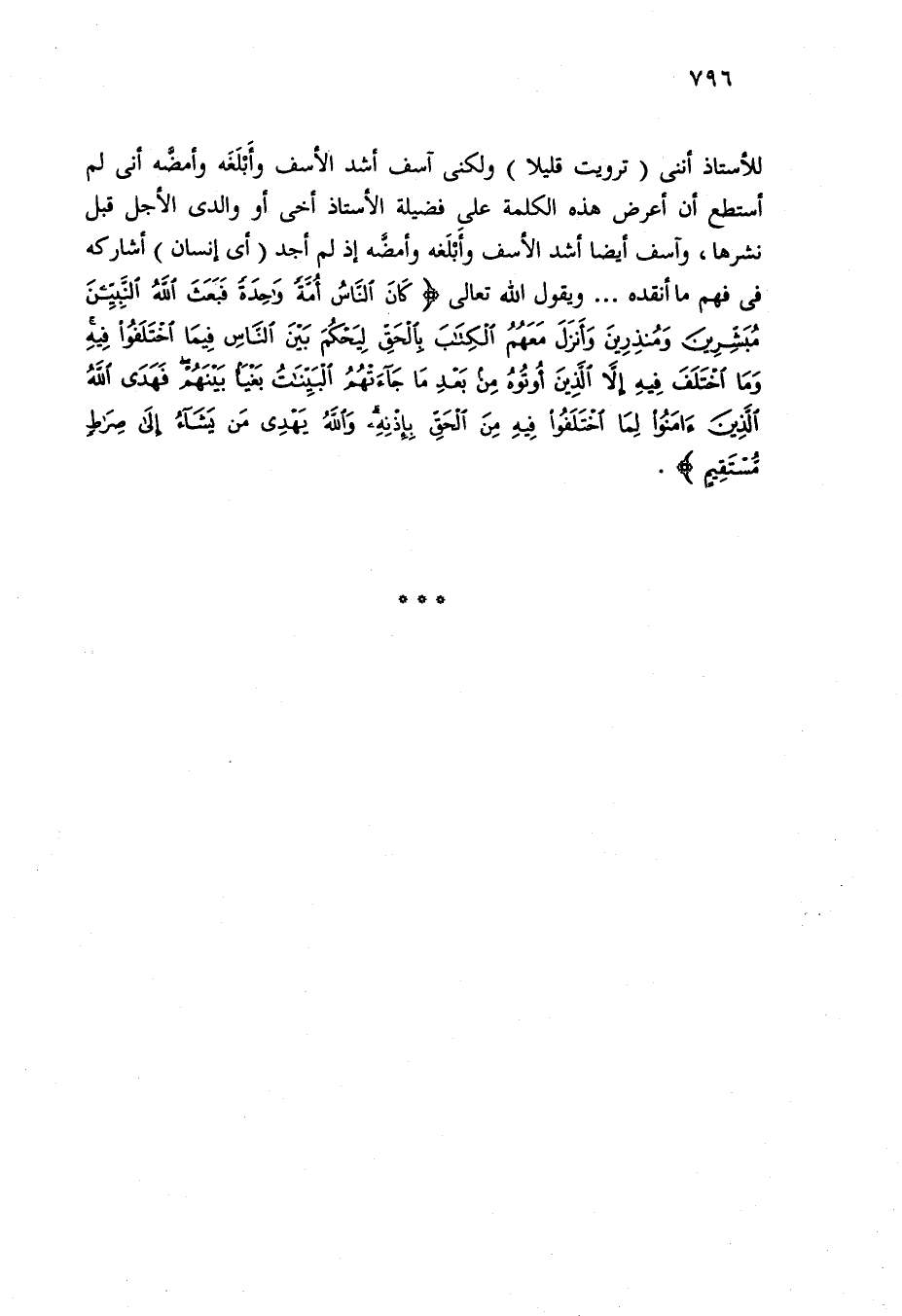 للأستاذ أننى (ترويت قليلا) ولكني آسف أشد الأسف وأَبْلَغَه وأمضَّه أنى لم أستطع أن أعرض هذه الكلمة على فضيلة الأستاذ أخي أو والدى الأجل قبل نشرها، وآسف أيضا أشد الأسف وأَبْلَغه وأمضَّه إذ لم أجد (أي إنسان) أشاركه في فهم ما أنقده. . . ويقول الله تعالى {كَانَ النَّاسُ أُمَّةً وَاحِدَةً فَبَعَثَ اللَّهُ النَّبِيِّينَ مُبَشِّرِينَ وَمُنْذِرِينَ وَأَنْزَلَ مَعَهُمُ الْكِتَابَ بِالْحَقِّ لِيَحْكُمَ بَيْنَ النَّاسِ فِيمَا اخْتَلَفُوا فِيهِ وَمَا اخْتَلَفَ فِيهِ إِلَّا الَّذِينَ أُوتُوهُ مِنْ بَعْدِ مَا جَاءَتْهُمُ الْبَيِّنَاتُ بَغْيًا بَيْنَهُمْ فَهَدَى اللَّهُ الَّذِينَ آمَنُوا لِمَا اخْتَلَفُوا فِيهِ مِنَ الْحَقِّ بِإِذْنِهِ وَاللَّهُ يَهْدِي مَنْ يَشَاءُ إِلَى صِرَاطٍ مُسْتَقِيمٍ}.