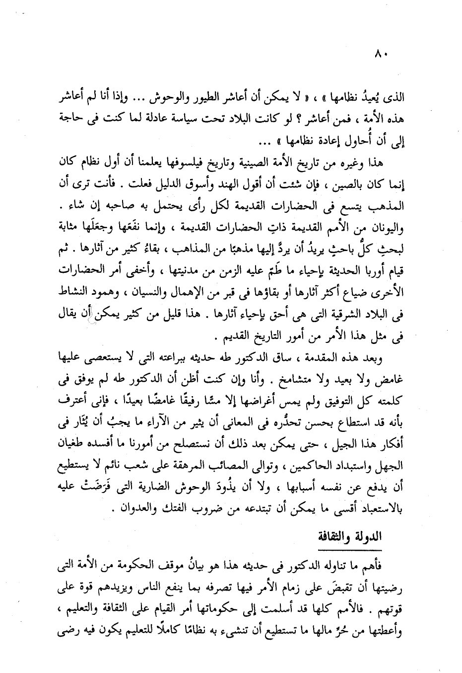 وبعد هذه المقدمة، ساق الدكتور طه حديثه ببراعته التي لا يستعصى عليها غامض ولا بعيد ولا متشامخ. وأنا وإن كنت أظن أن الدكتور طه لم يوفق في كلمته كل التوفيق ولم يمس أغراضها إلا مسًّا رفيقًا غامضًا بعيدًا، فإني أعترف بأنه قد استطاع بحسن تحدُّره في المعاني أن يثير من الآراء ما يجبُ أن يُثَار في أفكار هذا الجيل، حتى يمكن بعد ذلك أن نستصلح من أمورنا ما أفسده طغيان الجهل واستبداد الحاكمين، وتوالي المصائب المرهقة على شعب نائم لا يستطيع أن يدفع عن نفسه أسبابها، ولا أن يذودَ الوحوش الضارية التي فَرَضَتْ عليه بالاستعباد أقسى ما يمكن أن تبتدعه من ضروب الفتك والعدوان.