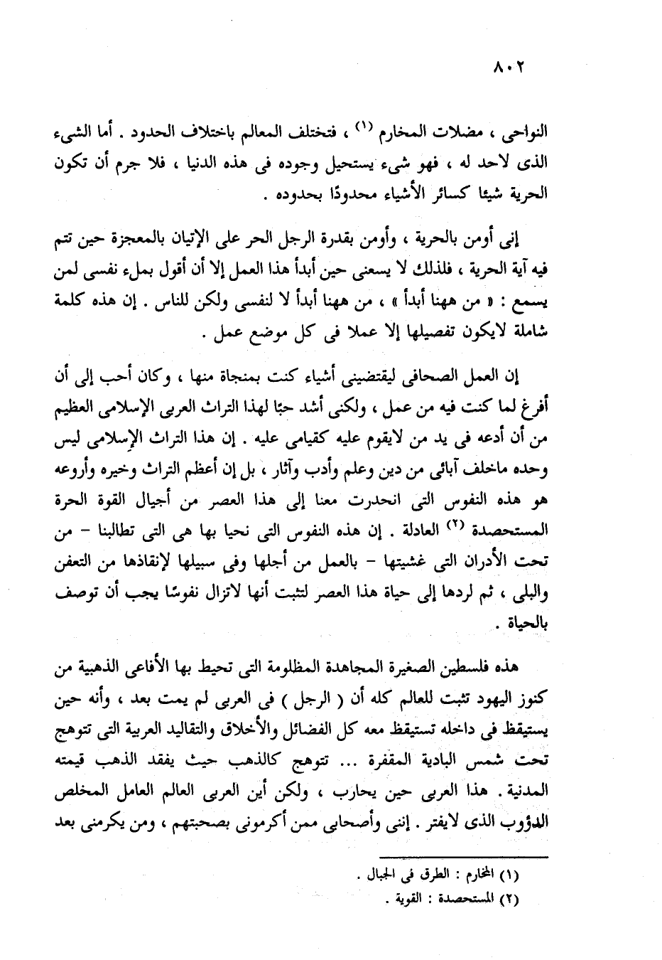 هذه فلسطين الصغيرة المجاهدة المظلومة التي تحيط بها الأفاعى الذهبية من كنوز اليهود تثبت للعالم كله أن (الرجل) في العربي لم يمت بعد، وأنه حين يستيقظ في داخله تستيقظ معه كل الفضائل والأخلاق والتقاليد العربية التي تتوهج تحت شمس البادية المقفرة. . . تتوهج كالذهب حيث يفقد الذهب قيمته المدنية. هذا العربي حين يحارب، ولكن أين العربي العالم العامل المخلص الدؤوب الذي لا يفتر. إننى وأصحابى ممن أكرمونى بصحبتهم، ومن يكرمنى بعد