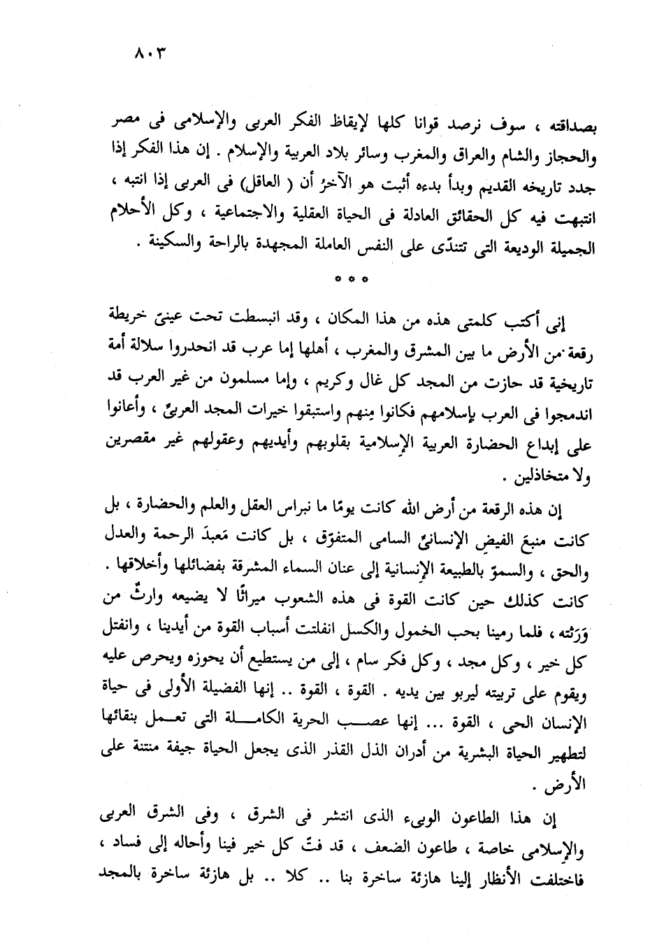 إني أكتب كلمتى هذه من هذا المكان، وقد انبسطت تحت عينيّ خريطة رقعة من الأرض ما بين المشرق والمغرب، أهلها إما عرب قد انحدروا سلالة أمة تاريخية قد حازت من المجد كل غال وكريم، وإما مسلمون من غير العرب قد اندمجوا في العرب بإسلامهم فكانوا منهم واستبقوا خيرات المجد العربيّ، وأعانوا على إبداع الحضارة العربية الإِسلامية بقلوبهم وأيديهم وعقولهم غير مقصرين ولا متخاذلين.