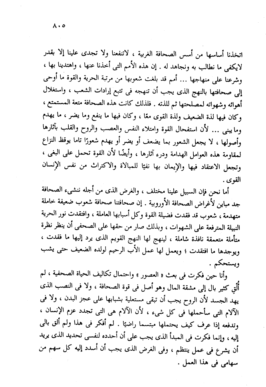 أما نحن فإن السبيل علينا مختلف، والغرض الذي من أجله ننشيء الصحافة جد مباين لأغراض الصحافة الأوروبية. إن صحافتنا صحافة شعوب ضعيفة خاملة متهدمة، شعوب قد فقدت فضيلة القوة وكل أسبابها العاملة، وافتقدت نور الحرية النبيلة المترفعة على الشهوات، وبذلك صار من حقها على الصحفي أن ينظر نظرة متأملة متعمقة نافذة شاملة، لينهج لها النهج القويم الذي يرد إليها ما فقدت، ويوجدها ما افتقدت؛ ويعمل لها عمل الأب الرحيم لولده الضعيف حتى يشب ويستحكم.