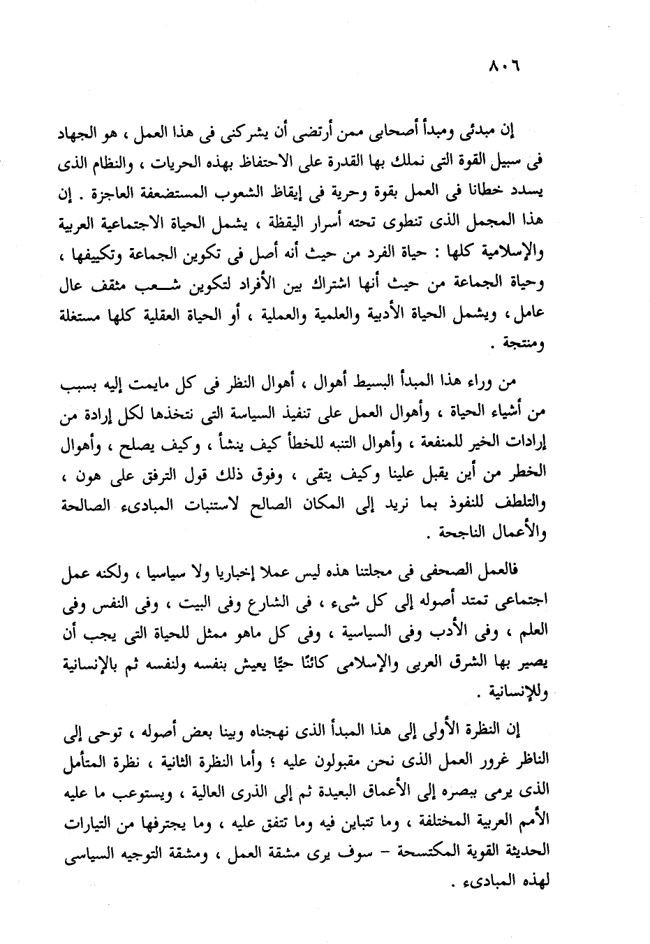 فالعمل الصحفي في مجلتنا هذه ليس عملا إخباريا ولا سياسيا، ولكنه عمل اجتماعى تمتد أصوله إلى كل شيء، في الشارع وفي البيت، وفي النفس وفي العلم، وفي الأدب وفي السياسية، وفي كل ما هو ممثل للحياة التي يجب أن يصير بها الشرق العربي والإسلامي كائنًا حيًّا يعيش بنفسه ولنفسه ثم بالإنسانية وللإنسانية.