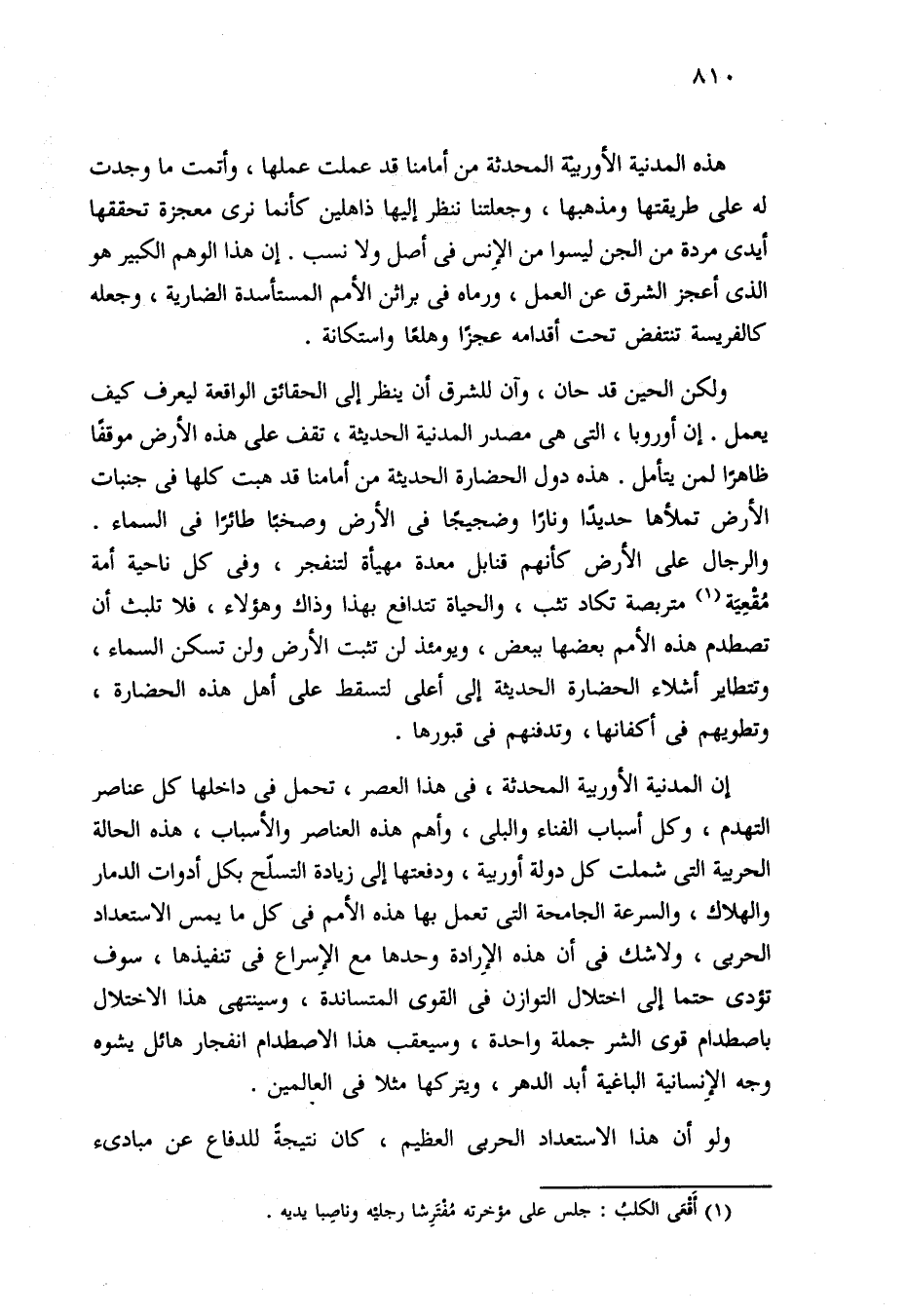 إن المدنية الأوربية المحدثة، في هذا العصر، تحمل في داخلها كل عناصر التهدم، وكل أسباب الفناء والبلى، وأهم هذه العناصر والأسباب، هذه الحالة الحربية التي شملت كل دولة أوربية، ودفعتها إلى زيادة التسلّح بكل أدوات الدمار والهلاك، والسرعة الجامحة التي تعمل بها هذه الأمم في كل ما يمس الاستعداد الحربي، ولا شك في أن هذه الإِرادة وحدها مع الإِسراع في تنفيذها، سوف تؤدى حتما إلى اختلال التوازن في القوى المتساندة، وسينتهي هذا الاختلال باصطدام قوى الشر جملة واحدة، وسيعقب هذا الاصطدام انفجار هائل يشوه وجه الإِنسانية الباغية أبد الدهر، ويتركها مثلا في العالمين.
