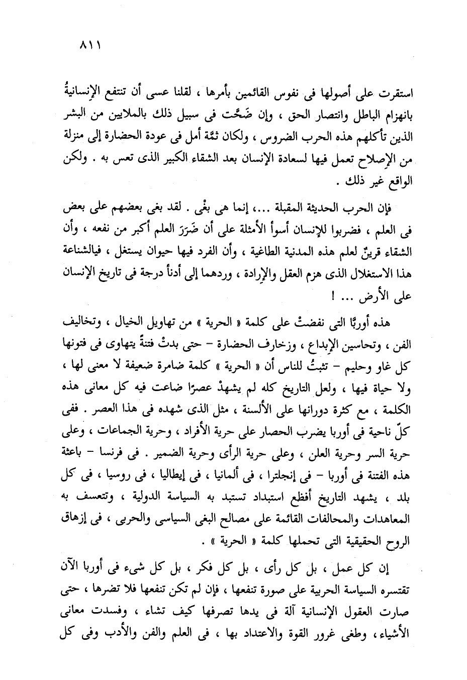 إن كل عمل، بل كل رأي، بل كل فكر، بل كل شيء في أوربا الآن تقتسره السياسة الحربية على صورة تنفعها، فإن لم تكن تنفعها فلا تضرها، حتى صارت العقول الإنسانية آلة في يدها تصرفها كيف تشاء، وفسدت معاني الأشياء، وطغى غرور القوة والاعتداد بها، في العلم والفن والأدب وفي كل