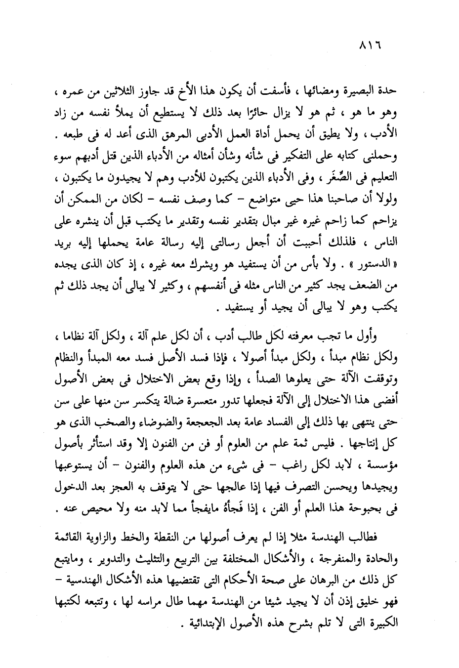 حدة البصيرة ومضائها، فأسفت أن يكون هذا الأخ قد جاوز الثلاثين من عمره، وهو ما هو، ثم هو لا يزال حائرًا بعد ذلك لا يستطيع أن يملأ نفسه من زاد الأدب، ولا يطيق أن يحمل أداة العمل الأدبى المرهق الذي أعد له في طبعه. وحملنى كتابه على التفكير في شأنه وشأن أمثاله من الأدباء الذين قتل أدبهم سوء التعليم في الصِّغَر، وفي الأدباء الذين يكتبون للأدب وهم لا يجيدون ما يكتبون، ولولا أن صاحبنا هذا حيى متواضع -كما وصف نفسه- لكان من الممكن أن يزاحم كما زاحم غيره غير مبال بتقدير نفسه وتقدير ما يكتب قبل أن ينشره على الناس، فلذلك أحببت أن أجعل رسالتي إليه رسالة عامة يحملها إليه بريد "الدستور". ولا بأس من أن يستفيد هو ويشرك معه غيره، إذ كان الذي يجده من الضعف يجد كثير من الناس مثله في أنفسهم، وكثير لا يبالى أن يجد ذلك ثم يكتب وهو لا يبالى أن يجيد أو يستفيد.