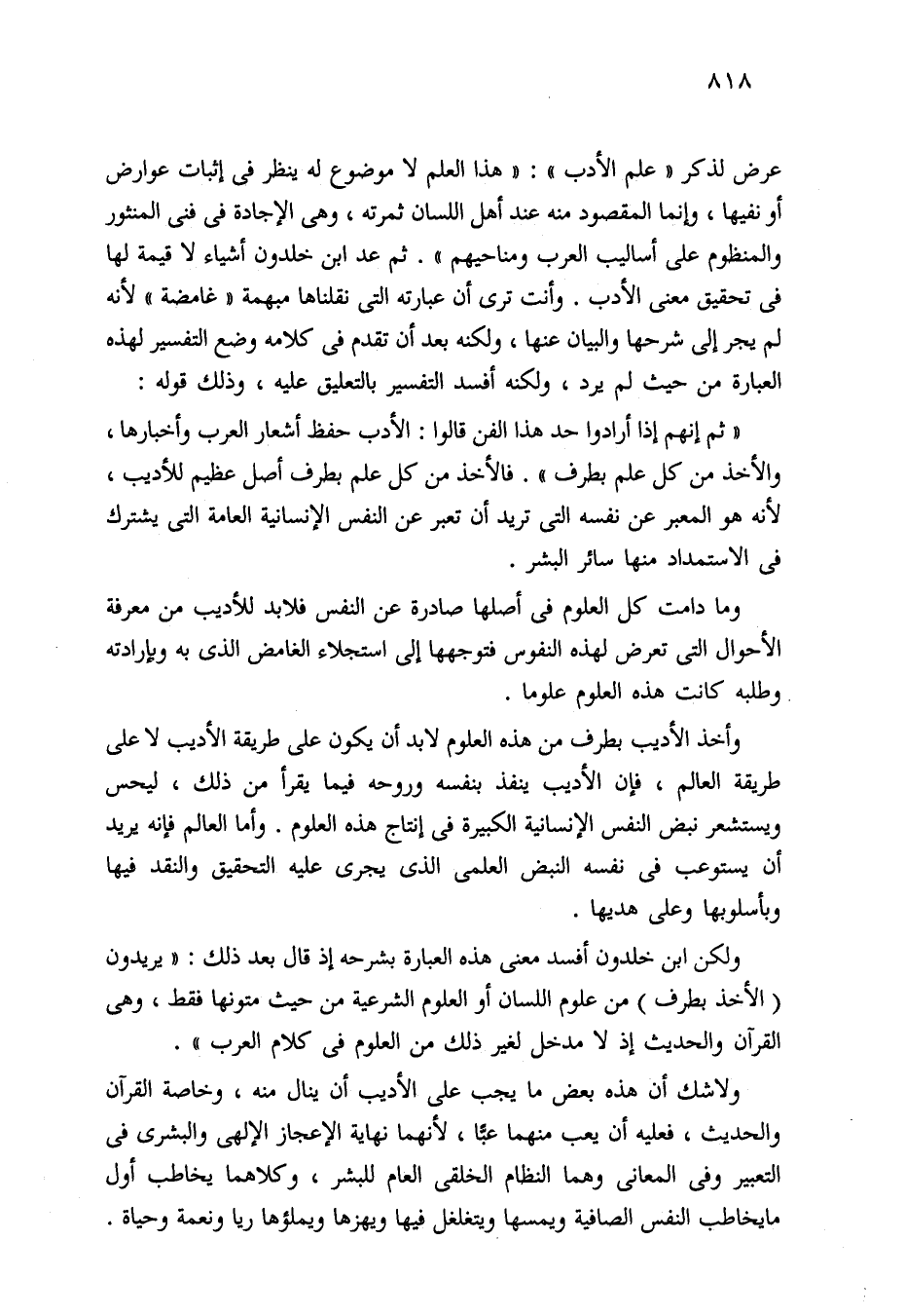 عرض لذكر "علم الأدب": "هذا العلم لا موضوع له ينظر في إثبات عوارض أو نفيها، وإنما المقصود منه عند أهل اللسان ثمرته، وهي الإجادة في فني المنثور والمنظوم على أساليب العرب ومناحيهم". ثم عد ابن خلدون أشياء لا قيمة لها في تحقيق معنى الأدب. وأنت ترى أن عبارته التي نقلناها مبهمة "غامضة" لأنه لم يجر إلى شرحها والبيان عنها، ولكنه بعد أن تقدم في كلامه وضع التفسير لهذه العبارة من حيث لم يرد، ولكنه أفسد التفسير بالتعليق عليه، وذلك قوله:
