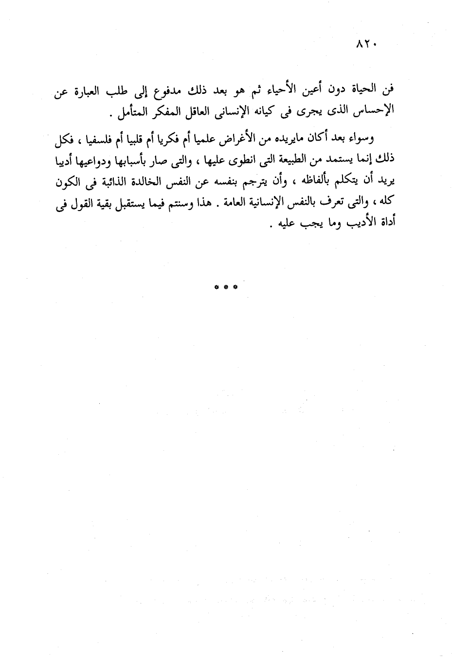 فن الحياة دون أعين الأحياء ثم هو بعد ذلك مدفوع إلى طلب العبارة عن الأحساس الذي يجرى في كيانه الإنساني العاقل المفكر المتأمل.