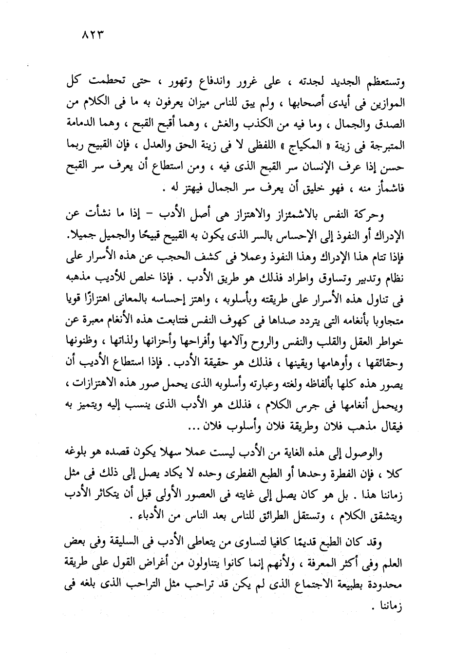 وحركة النفس بالاشمئزاز والاهتزاز هي أصل الأدب -إذا ما نشأت عن الإدراك أو النفوذ إلى الإحساس بالسر الذي يكون به القبيح قبيحًا والجميل جميلا. فإذا تتام هذا الإدراك وهذا النفوذ وعملا في كشف الحجب عن هذه الأسرار على نظام وتدبير وتساوق واطراد فذلك هو طريق الأدب. فإذا خلص للأديب مذهبه في تناول هذه الأسرار على طريقته وبأسلوبه، واهتز إحساسه بالمعاني اهتزازًا قويا متجاوبا بأنغامه التي يتردد صداها في كهوف النفس فتتابعت هذه الأنغام معبرة عن خواطر العقل والقلب والنفس والروح وآلامها وأفراحها وأحزانها ولذاتها، وظنونها وحقائقها، وأوهامها ويقينها، فذلك هو حقيقة الأدب. فإذا استطاع الأديب أن يصور هذه كلها بألفاظه ولغته وعبارته وأسلوبه الذي يحمل صور هذه الاهتزازات، ويحمل أنغامها في جرس الكلام، فذلك هو الأدب الذي ينسب إليه ويتميز به فيقال مذهب فلان وطريقة فلان وأسلوب فلان. . .