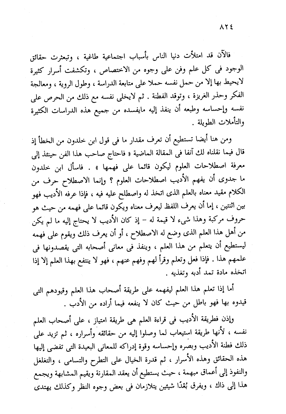 ومن هنا أيضا تستطيع أن تعرف مقدار ما في قول ابن خلدون من الخطأ إذ قال فيما نقلناه لك آنفا في المقالة الماضية "فاحتاج صاحب هذا الفن حينئذ إلى معرفة اصطلاحات العلوم ليكون قائما على فهمها". فاسأل ابن خلدون ما جدوى أن يفهم الأديب اصطلاحات العلوم؟ وإنما الاصطلاح حرف من الكلام مقيد معناه بالعلم الذي اتخذ له واصطلح عليه فيه، فإذا عرفه الأديب فهو بين اثنتين، إما أن يعرف اللفظ ليعرف معناه ويكون قائما على فهمه من حيث هو حروف مركبة وهذا شيء لا قيمة له -إذ كان الأديب لا يحتاج إليه ما لم يكن من أهل هذا العلم الذي وضع له الاصطلاح، أو أن يعرف ذلك ويقوم على فهمه ليستطيع أن يتعلم من هذا العلم، وينفذ في معاني أصحابه التي يقصدونها في علمهم هذا. فإذا فعل وتعلم وقرأ لهم وفهم عنهم، فهو لا ينتفع بهذا العلم إلا إذا اتخذه مادة تمد أدبه وتغذيه.