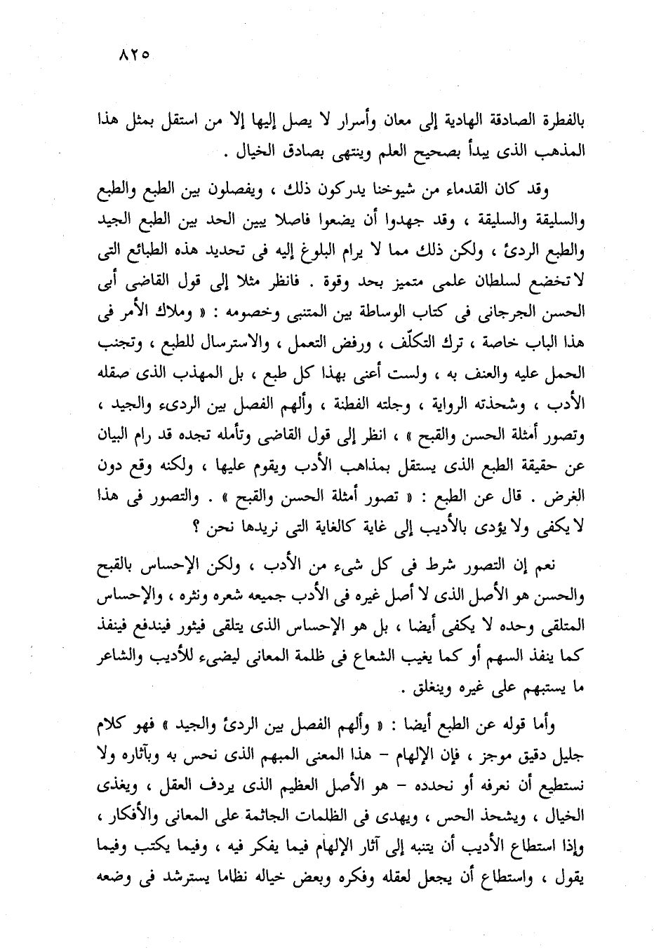 وقد كان القدماء من شيوخنا يدركون ذلك، ويفصلون بين الطبع والطبع والسليقة والسليقة، وقد جهدوا أن يضعوا فاصلا يبين الحد بين الطبع الجيد والطبع الردئ، ولكن ذلك مما لا يرام البلوغ إليه في تحديد هذه الطبائع التي لا تخضع لسلطان علمي متميز بحد وقوة. فانظر مثلا إلى قول القاضي أبي الحسن الجرجانى في كتاب الوساطة بين المتنبى وخصومه: "وملاك الأمر في هذا الباب خاصة، ترك التكلّف، ورفض التعمل، والاسترسال للطبع، وتجنب الحمل عليه والعنف به، ولست أعنى بهذا كل طبع، بل المهذب الذي صقله الأدب، وشحذته الرواية، وجلته الفطنة، وألهم الفصل بين الردئ والجيد، وتصور أمثلة الحسن والقبح"، انظر إلى قول القاضي وتأمله تجده قد رام البيان عن حقيقة الطبع الذي يستقل بمذاهب الأدب ويقوم عليها، ولكنه وقع دون الغرض. قال عن الطبع: "تصور أمثلة الحسن والقبح". والتصور في هذا لا يكفي ولا يؤدي بالأديب إلى غاية كالغاية التي نريدها نحن؟