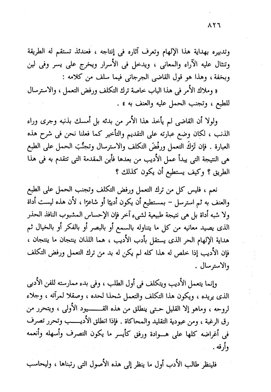 وتدبيره بهداية هذا الإلهام وتعرف آثاره في إنتاجه، فعندئذ تستقم له الطريقة وتنثال عليه الآراء والمعاني، ويدخل في الأسرار ويخرج على يسر وفي لين وبخفة، وهذا هو قول القاضي الجرجانى فيما سلف من كلامه: