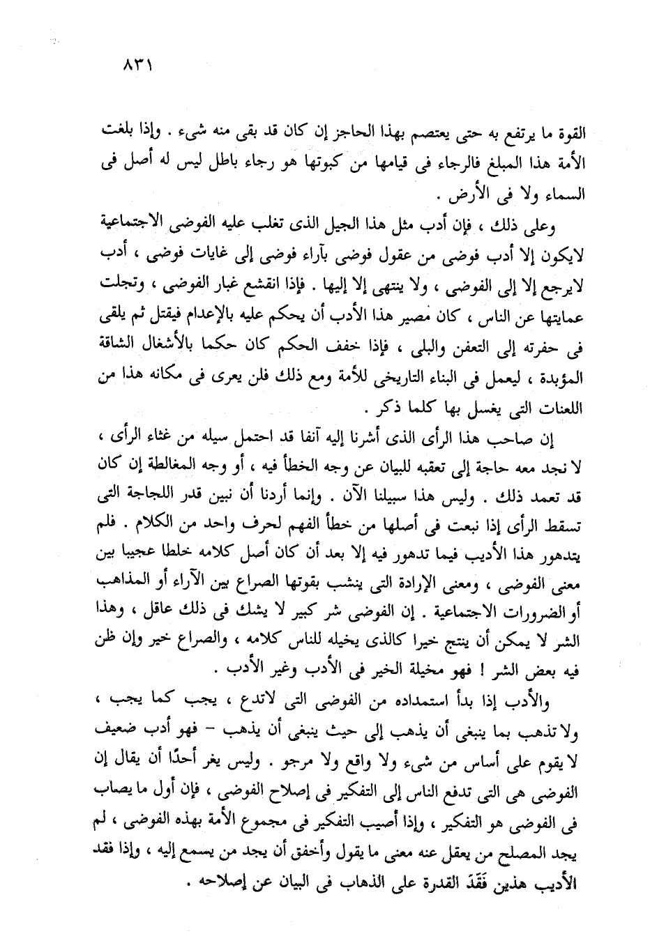 والأدب إذا بدأ استمداده من الفوضى التي لا تدع، يجب كما يجب، ولا تذهب بما ينبغي أن يذهب إلى حيث ينبغي أن يذهب -فهو أدب ضعيف لا يقوم على أساس من شيء ولا واقع ولا مرجو. وليس يغر أحدًا أن يقال إن الفوضى هي التي تدفع الناس إلى التفكير في إصلاح الفوضى، فإن أول ما يصاب في الفوضى هو التفكير، وإذا أصيب التفكير في مجموع الأمة بهذه الفوضى، لم يجد المصلح من يعقل عنه معنى ما يقول وأخفق أن يجد من يسمع إليه، وإذا فقد الأديب هذين فَقَدَ القدرة على الذهاب في البيان عن إصلاحه.