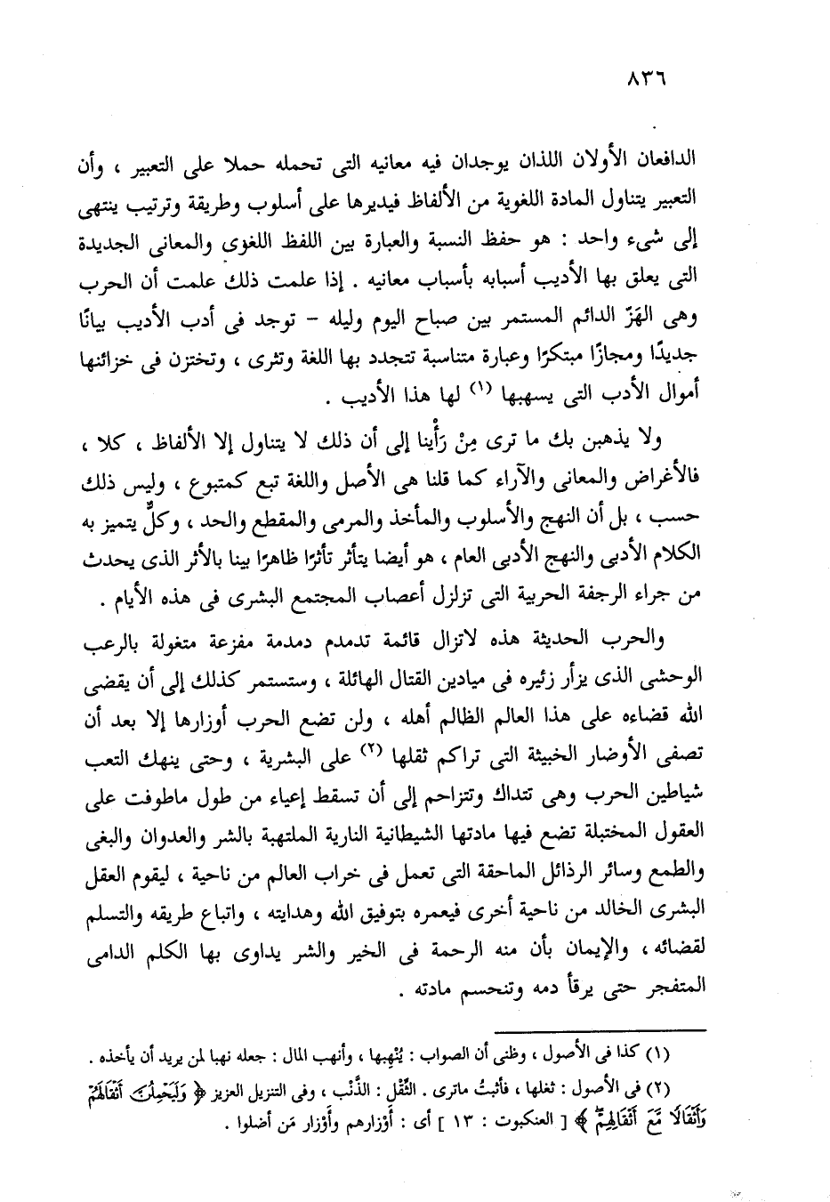 ولا يذهبن بك ما ترى منْ رَأْينا إلى أن ذلك لا يتناول إلا الألفاظ، كلا، فالأغراض والمعاني والآراء كما قلنا هي الأصل واللغة تبع كمتبوع، وليس ذلك حسب، بل أن النهج والأسلوب والمأخذ والمرمى والمقطع والحد، وكلٌّ يتميز به الكلام الأدبى والنهج الأدبى العام، هو أيضا يتأثر تأثرًا ظاهرًا بينا بالأثر الذي يحدث من جراء الرجفة الحربية التي تزلزل أعصاب المجتمع البشرى في هذه الأيام.