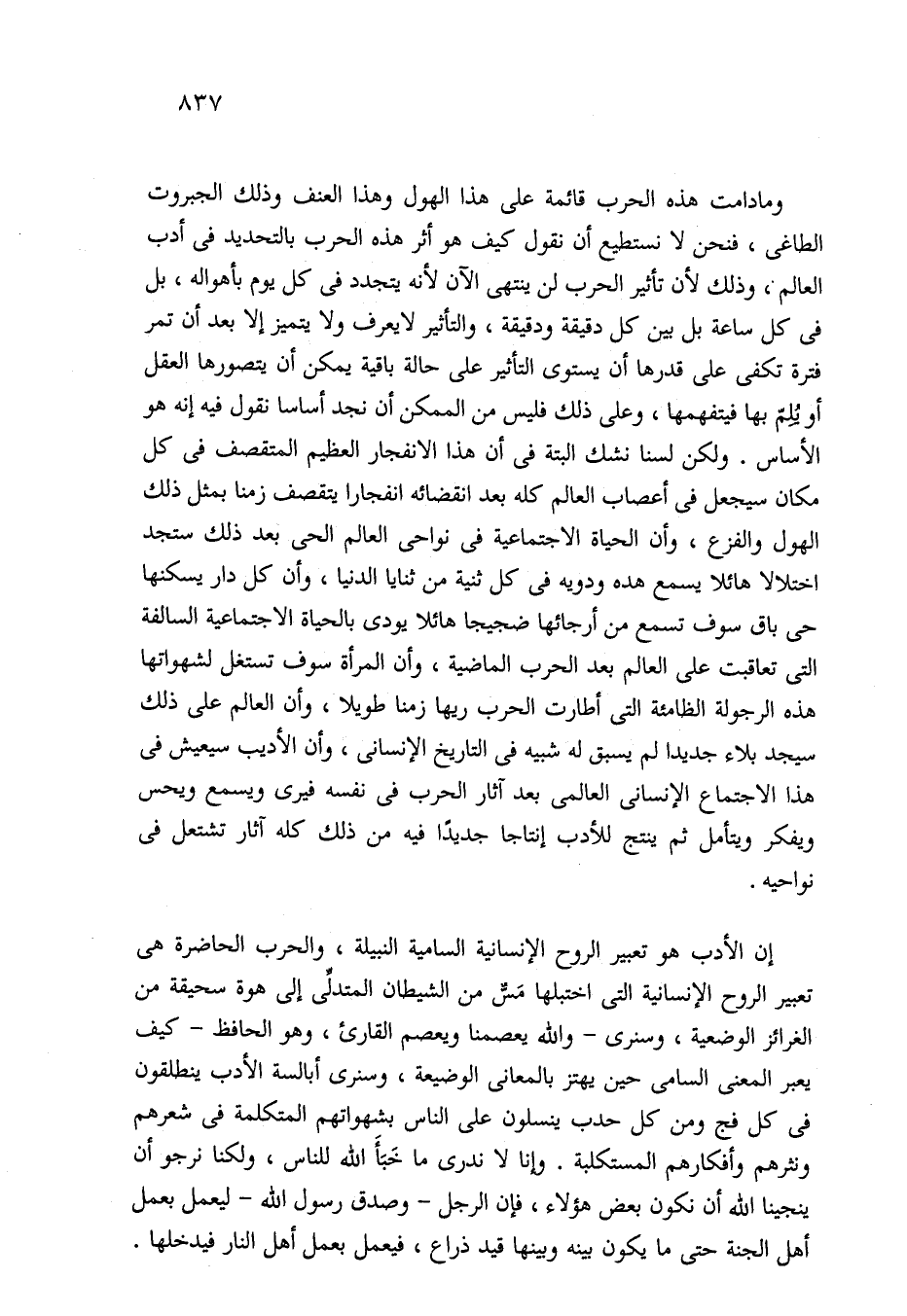 إن الأدب هو تعبير الروح الإنسانية السامية النبيلة، والحرب الحاضرة هي تعبير الروح الإنسانية التي اختبلها مَسٌّ من الشيطان المتدلِّي إلى هوة سحيقة من الغرائز الوضعية، وسنرى -والله يعصمنا ويعصم القارئ، وهو الحافظ- كيف يعبر المعنى السامى حين يهتز بالمعاني الوضيعة، وسنرى أبالسة الأدب ينطلقون في كل فج ومن كل حدب ينسلون على الناس بشهواتهم المتكلمة في شعرهم ونثرهم وأفكارهم المستكلبة. وإنا لا ندرى ما خَبَأَ الله للناس، ولكنا نرجو أن ينجينا الله أن نكون بعض هؤلاء، فإن الرجل -وصدق رسول الله- ليعمل بعمل أهل الجنة حتى ما يكون بينه وبينها قيد ذراع، فيعمل بعمل أهل النار فيدخلها.