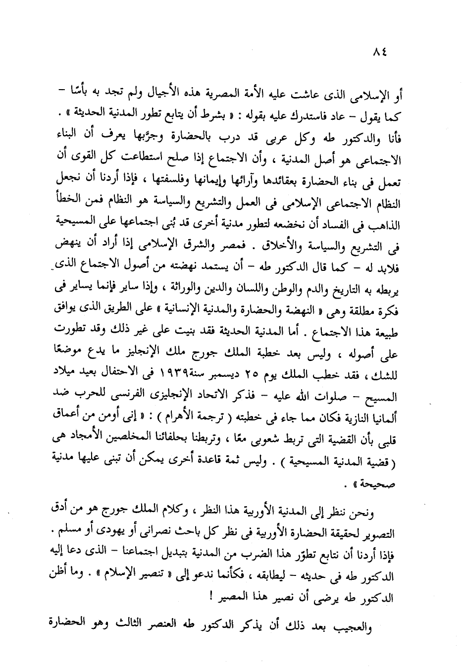 أو الإسلامي الذي عاشت عليه الأمة المصرية هذه الأجيال ولم تجد به بأسًا -كما يقول- عاد فاستدرك عليه بقوله: "بشرط أن يتابع تطور المدنية الحديثة". فأنا والدكتور طه وكل عربي قد درب بالحضارة وجرَّبها يعرف أن البناء الاجتماعي هو أصل المدنية، وأن الاجتماع إذا صلح استطاعت كل القوى أن تعمل في بناء الحضارة بعقائدها وآرائها وإيمانها وفلسفتها، فإذا أردنا أن نجعل النظام الاجتماعي الإسلامي في العمل والتشريع والسياسة هو النظام فمن الخطأ الذاهب في الفساد أن نخضعه لتطور مدنية أخرى قد بُنى اجتماعها على المسيحية في التشريع والسياسة والأخلاق. فمصر والشرق الإسلامي إذا أراد أن ينهض فلابد له -كما قال الدكتور طه- أن يستمد نهضته من أصول الاجتماع الذي يربطه به التاريخ والدم والوطن واللسان والدين والوراثة، وإذا ساير فإنما يساير في فكرة مطلقة وهي "النهضة والحضارة والمدنية الإنسانية" على الطريق الذي يوافق طبيعة هذا الاجتماع. أما المدنية الحديثة فقد بنيت على غير ذلك وقد تطورت على أصوله، وليس بعد خطبة الملك جورج ملك الإنجليز ما يدع موضعًا للشك، فقد خطب الملك يوم 25 ديسمبر سنة 1939 في الاحتفال بعيد ميلاد المسيح -صلوات الله عليه- فذكر الاتحاد الإنجليزي الفرنسي للحرب ضد ألمانيا النازية فكان مما جاء في خطته (ترجمة الأهرام): "إني أومن من أعماق قلبي بأن القضية التي تربط شعوبي معًا، وتربطنا بحلفائنا المخلصين الأمجاد هي (قضية المدنية المسيحية). وليس ثمة قاعدة أخرى يمكن أن تبنى عليها مدنية صحيحة".