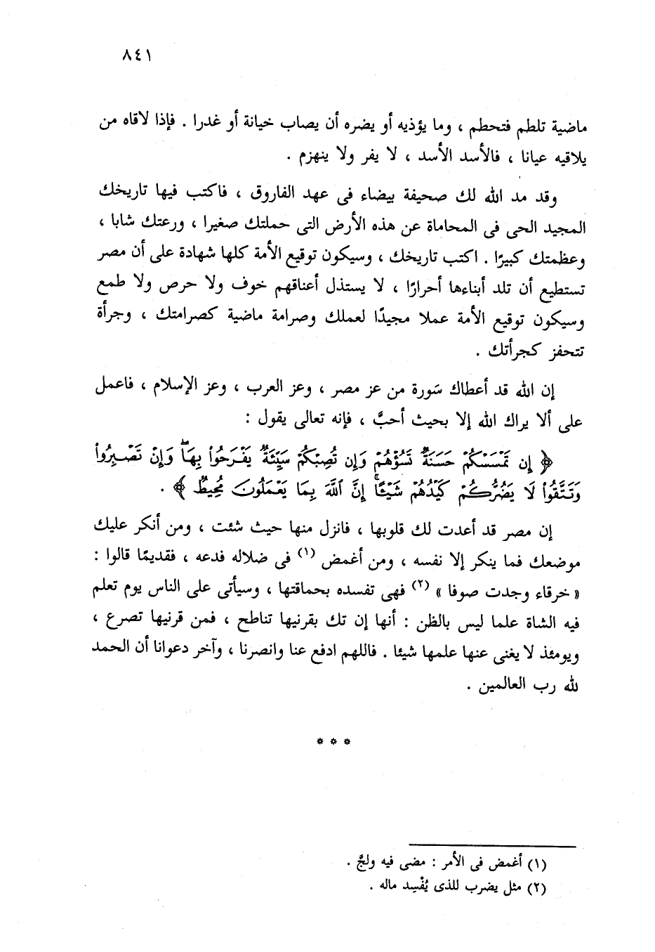 وقد مد الله لك صحيفة بيضاء في عهد الفاروق، فاكتب فيها تاريخك المجيد الحي في المحاماة عن هذه الأرض التي حملتك صغيرا، ورعتك شابا، وعظمتك كبيرًا. اكتب تاريخك، وسيكون توقيع الأمة كلها شهادة على أن مصر تستطيع أن تلد أبناءها أحرارًا، لا يستذل أعناقهم خوف ولا حرص ولا طمع وسيكون توقيع الأمة عملا مجيدًا لعملك وصرامة ماضية كصرامتك، وجرأة تتحفز كجرأتك.