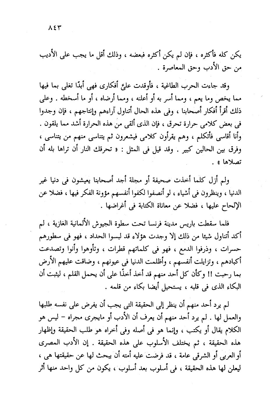لم يرد أحد منهم أن ينظر إلى الحقيقة التي يجب أن يفرض على نفسه طلبها والعمل لها. لم يرد أحد منهم أن يعرف أن الأدب أو ما يجرى مجراه -ليس هو الكلام يقال أو يكتب، وإنما هو في أصله وفي أخراه هو طلب الحقيقة وإظهار هذه الحقيقة، ثم يختلف الأسلوب على هذه الحقيقة. إن الأدب المصري أو العربي أو الشرقي عامة، قد فرضت عليه أمته أن يبحث لها عن حقيقتها هي، ليعلق لها هذه الحقيقة، في أسلوب بعد أسلوب، يكون من كل واحد منها أثر