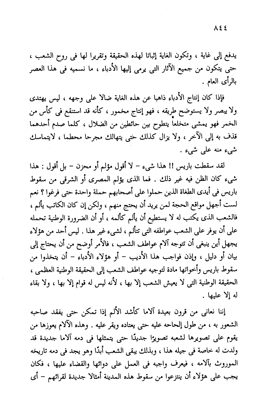 لقد سقطت باريس! ! هذا شيء -لا أقول مؤلم أو محزن- بل أقول: هذا شيء كان الظن فيه غير ذلك. فما الذي يؤلم المصري أو الشرقي من سقوط باريس في أيدى الطغاة الذين حملوا على أصحابهم حملة واحدة حتى فرغوا؟ نعم لست أجهل مواقع الحجة لمن يريد أن يحتج منهم، ولكن إن كان الكاتب يألم، فالشعب الذي يكتب له لا يستطيع أن يألم كألمه، أو أن الضرورة الوطنية تحمله على أن يوفر على الشعب عواطفه التي تتألم، لشيء غير هذا. ليس أحد من هؤلاء يجهل أين ينبغي أن تتوجه آلام عواطف الشعب، فالأمر أوضح من أن يحتاج إلى بيان أو دليل، وإذن فواجب هذا الأديب -أو هؤلاء الأدباء- أن يتخذوا من سقوط باريس وأخواتها مادة لتوجيه عواطف الشعب إلى الحقيقة الوطنية العظمى، الحقيقة الوطنية التي لا يعيش الشعب إلا بها، لأنه ليس له قوام إلا بها، ولا بقاء له إلا عليها.