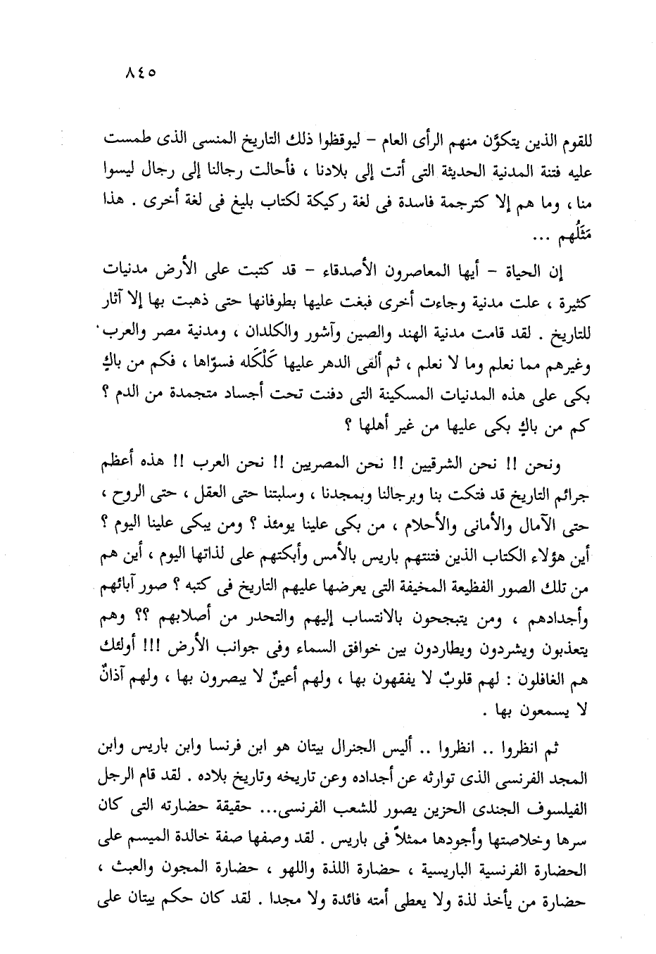 ونحن! ! نحن الشرقيين! ! نحن المصريين! ! نحن العرب! ! هذه أعظم جرائم التاريخ قد فتكت بنا وبرجالنا وبمجدنا، وسلبتنا حتى العقل، حتى الروح، حتى الآمال والأماني والأحلام، من بكى علينا يومئذ؟ ومن يبكى علينا اليوم؟ أين هؤلاء الكتاب الذين فتنتهم باريس بالأمس وأبكتهم على لذاتها اليوم، أين هم من تلك الصور الفظيعة المخيفة التي يعرضها عليهم التاريخ في كتبه؟ صور آبائهم وأجدادهم، ومن يتبجحون بالانتساب إليهم والتحدر من أصلابهم؟ ؟ وهم يتعذبون ويشردون ويطاردون بين خوافق السماء وفي جوانب الأرض! ! ! أولئك هم الغافلون: لهم قلوبٌ لا يفقهون بها، ولهم أعين لا يبصرون بها، ولهم آذانٌ لا يسمعون بها.