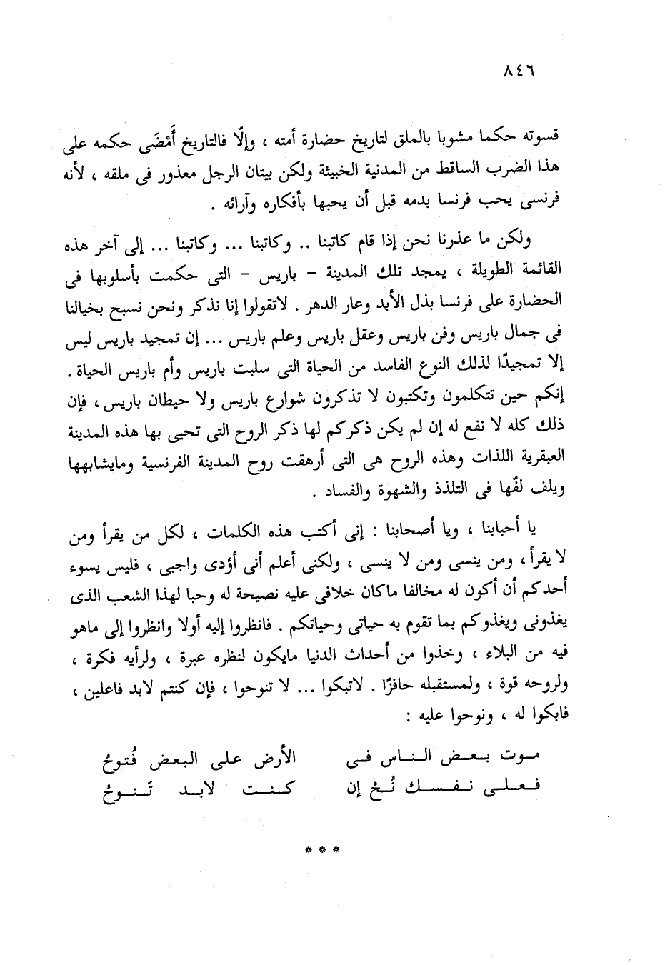 ولكن ما عذرنا نحن إذا قام كاتبنا. . وكاتبنا. . . وكاتبنا. . . إلى آخر هذه القائمة الطويلة، يمجد تلك المدينة -باريس- التي حكمت بأسلوبها في الحضارة على فرنسا بذل الأبد وعار الدهر. لا تقولوا إنا نذكر ونحن نسبح بخيالنا في جمال باريس وفن باريس وعقل باريس وعلم باريس. . . إن تمجيد باريس ليس إلا تمجيدًا لذلك النوع الفاسد من الحياة التي سلبت باريس وأم باريس الحياة. إنكم حين تتكلمون وتكتبون لا تذكرون شوارع باريس ولا حيطان باريس، فإن ذلك كله لا نفع له إن لم يكن ذكركم لها ذكر الروح التي تحيى بها هذه المدينة العبقرية اللذات وهذه الروح هي التي أرهقت روح المدينة الفرنسية وما يشابهها ويلف لفّها في التلذذ والشهوة والفساد.