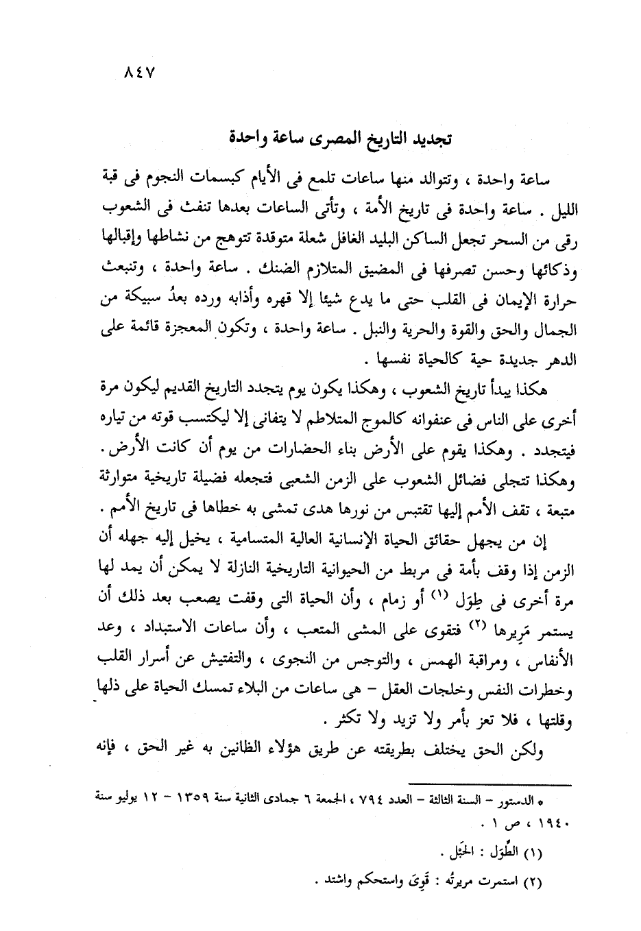 هكذا يبدأ تاريخ الشعوب، وهكذا يكون يوم يتجدد التاريخ القديم ليكون مرة أخرى على الناس في عنفوانه كالموج المتلاطم لا يتفانى إلا ليكتسب قوته من تياره فيتجدد. وهكذا يقوم على الأرض بناء الحضارات من يوم أن كانت الأرض. وهكذا تتجلى فضائل الشعوب على الزمن الشعبى فتجعله فضيلة تاريخية متوارثة متبعة، تقف الأمم إليها تقتبس من نورها هدى تمشي به خطاها في تاريخ الأمم. إن من يجهل حقائق الحياة الإنسانية العالية المتسامية، يخيل إليه جهله أن الزمن إذا وقف بأمة في مربط من الحيوانية التاريخية النازلة لا يمكن أن يمد لها مرة أخرى في طِوَل (¬1) أو زمام، وأن الحياة التي وقفت يصعب بعد ذلك أن يستمر مَرِيرها (¬2) فتقوى على المشى المتعب، وأن ساعات الاستبداد، وعد الأنفاس، ومراقبة الهمس، والتوجس من النجوى، والتفتيش عن أسرار القلب وخطرات النفس وخلجات العقل -هي ساعات من البلاء تمسك الحياة على ذلها وقلتها، فلا تعز بأمر ولا تزيد ولا تكثر.