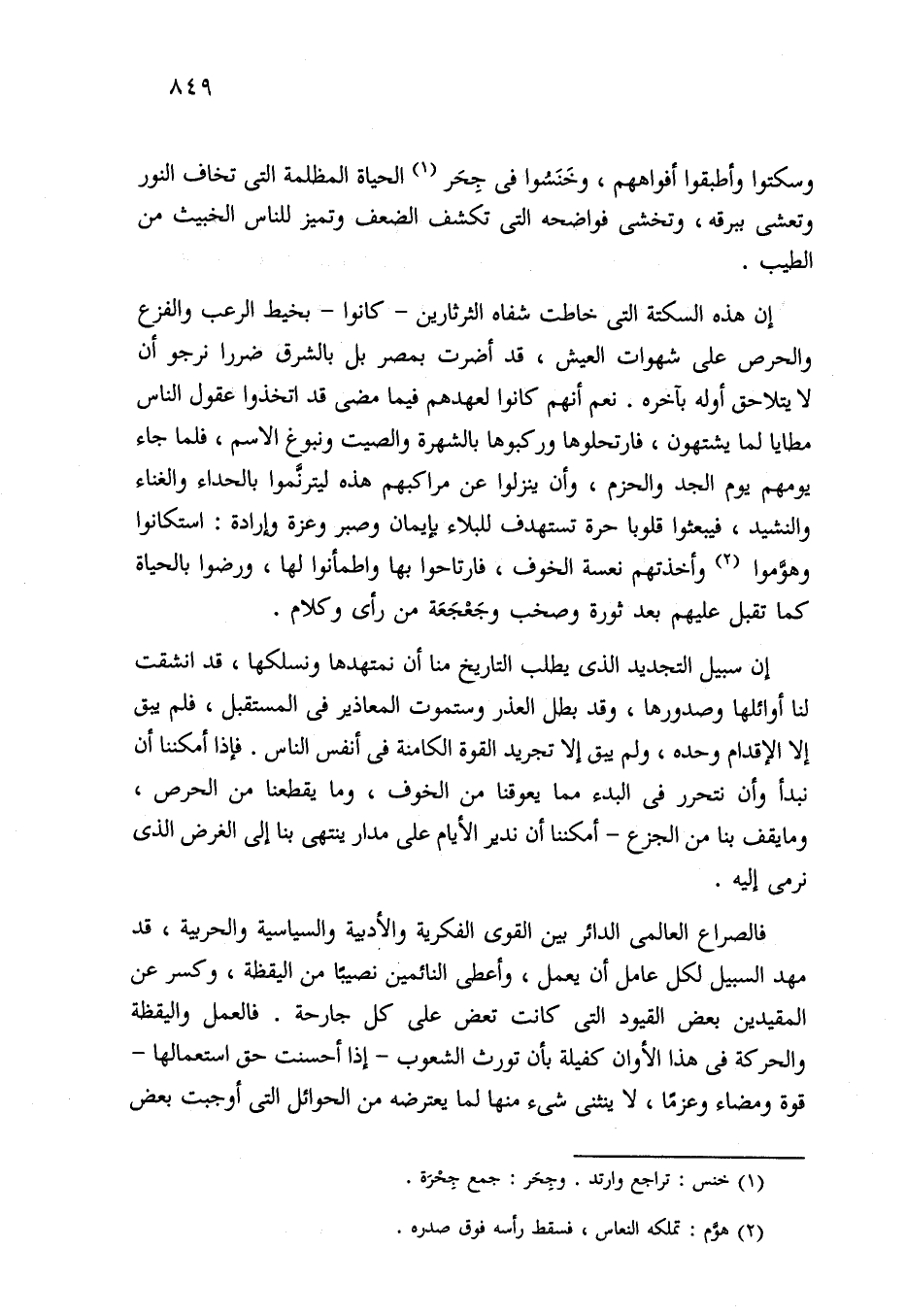 إن سبيل التجديد الذي يطلب التاريخ منا أن نمتهدها ونسلكها، قد انشقت لنا أوائلها وصدورها، وقد بطل العذر وستموت المعاذير في المستقبل، فلم يبق إلا الإقدام وحده، ولم يبق إلا تجريد القوة الكامنة في أنفس الناس. فإذا أمكننا أن نبدأ وأن نتحرر في البدء مما يعوقنا من الخوف، وما يقطعنا من الحرص، وما يقف بنا من الجزع -أمكننا أن ندير الأيام على مدار ينتهي بنا إلى الغرض الذي نرمى إليه.