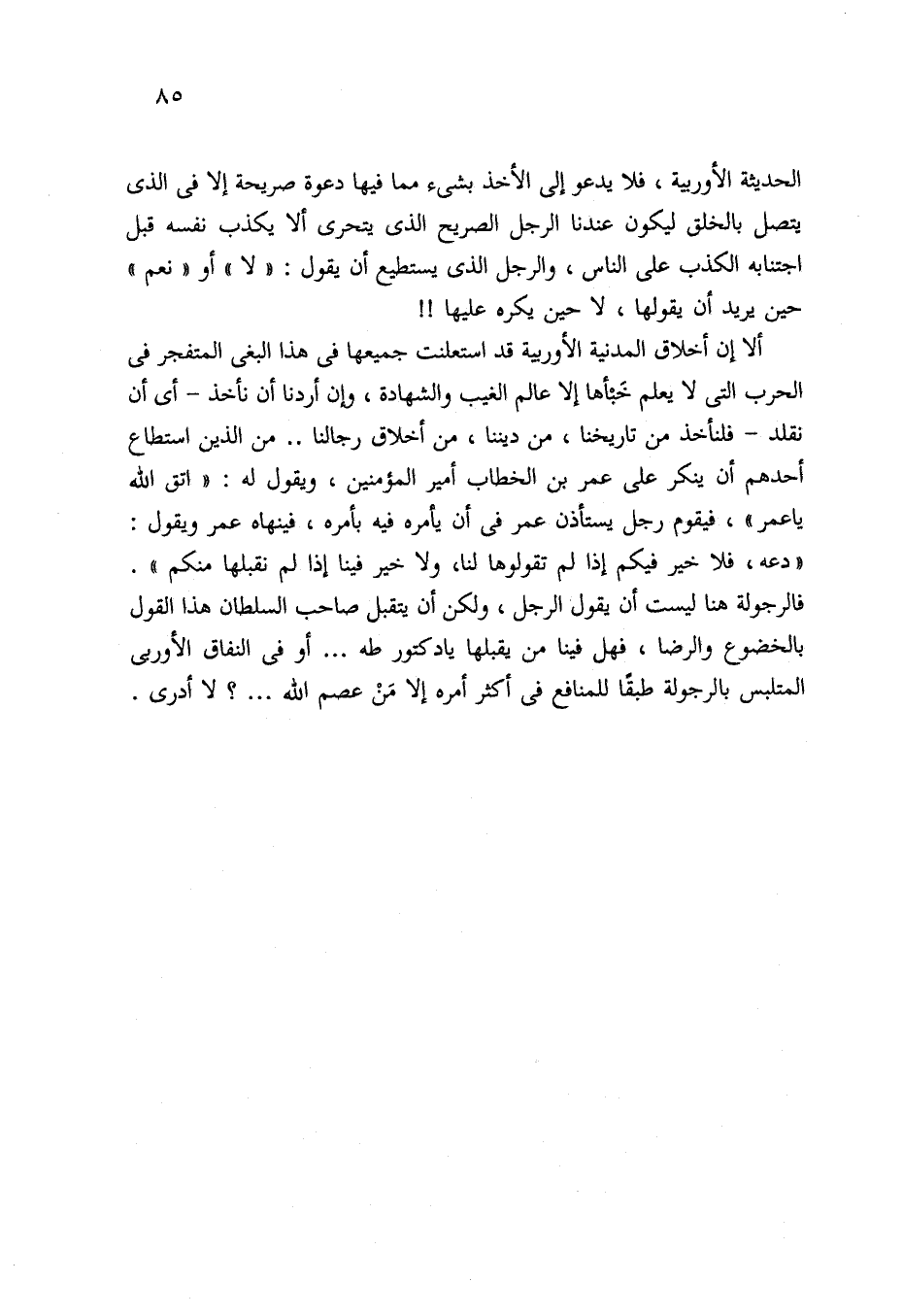 ألا إن أخلاق المدنية الأوربية قد استعلنت جميعها في هذا البغي المتفجر في الحرب التي لا يعلم خَبْأها إلا عالم الغيب والشهادة، وإن أردنا أن نأخذ -أي أن نقلد- فلنأخذ من تاريخنا، من ديننا، من أخلاق رجالنا .. من الذين استطاع أحدهم أن ينكر على عمر بن الخطاب أمير المؤمنين، ويقول له: "اتق الله يا عمر"، فيقوم رجل يستأذن عمر في أن يأمره فيه بأمره، فينهاه عمر ويقول: "دعه، فلا خير فيكم إذا لم تقولوها لنا، ولا خير فينا إذا لم نقبلها منكم". فالرجولة هنا ليست أن يقول الرجل، ولكن أن يتقبل صاحب السلطان هذا القول بالخضوع والرضا، فهل فينا من يقبلها يا دكتور طه. . . أو في النفاق الأوربي المتلبس بالرجولة طبقًا للمنافع في أكثر أمره إلا مَنْ عصم الله. . .؟ لا أدري.