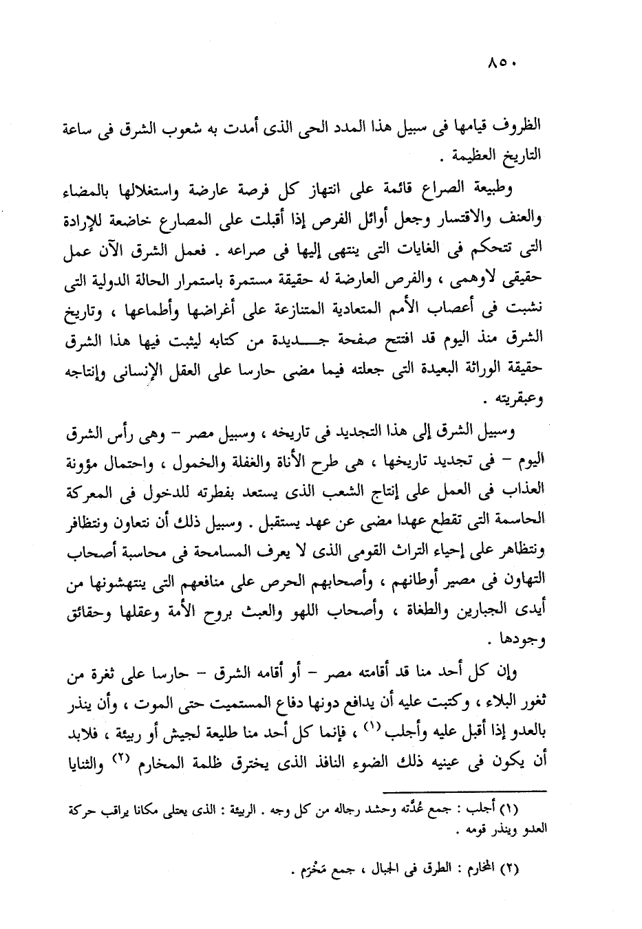 وسبيل الشرق إلى هذا التجديد في تاريخه، وسبيل مصر -وهي رأس الشرق اليوم- في تجديد تاريخها، هي طرح الأناة والغفلة والخمول، واحتمال مؤونة العذاب في العمل على إنتاج الشعب الذي يستعد بفطرته للدخول في المعركة الحاسمة التي تقطع عهدا مضى عن عهد يستقبل. وسبيل ذلك أن نتعاون ونتظافر ونتظاهر على إحياء التراث القومى الذي لا يعرف المسامحة في محاسبة أصحاب التهاون في مصير أوطانهم، وأصحابهم الحرص على منافعهم التي ينتهشونها من أيدى الجبارين والطغاة، وأصحاب اللهو والعبث بروح الأمة وعقلها وحقائق وجودها.