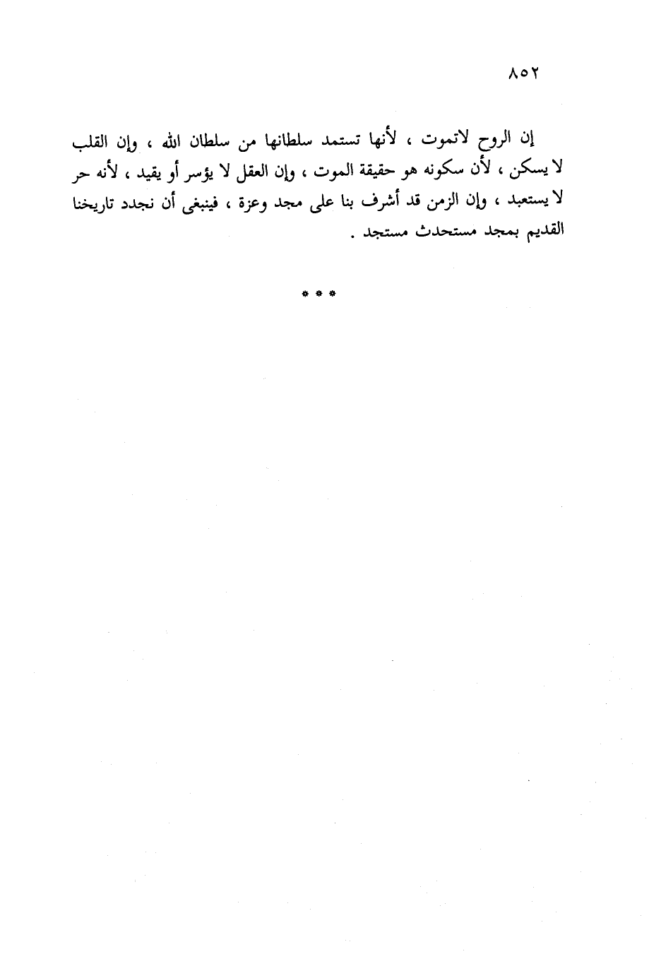 إن الروح لا تموت، لأنها تستمد سلطانها من سلطان الله، وإن القلب لا يسكن، لأن سكونه هو حقيقة الموت، وإن العقل لا يؤسر أو يقيد، لأنه حر لا يستعبد، وإن الزمن قد أشرف بنا على مجد وعزة، فينبغي أن نجدد تاريخنا القديم بمجد مستحدث مستجد.