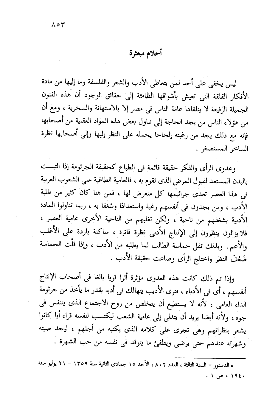 (*) الدستور -السنة الثالثة، العدد 802، الأحد 15 جمادى الثانية سنة 1359 - 21 يوليو سنة 1940، ص 1.