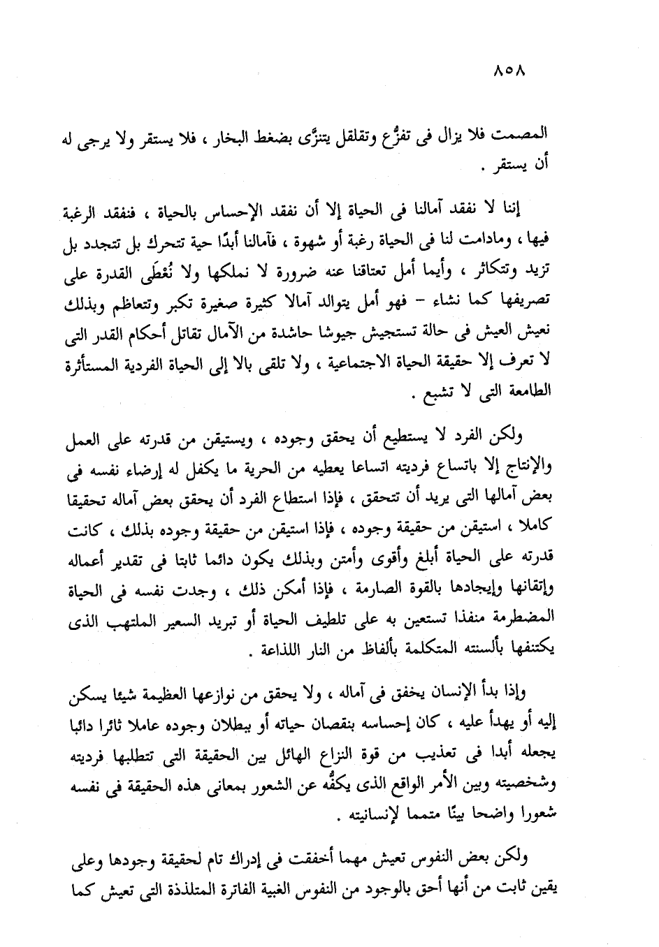 إننا لا نفقد آمالنا في الحياة إلا أن نفقد الإحساس بالحياة، فنفقد الرغبة فيها، ومادامت لنا في الحياة رغبة أو شهوة، فآمالنا أبدًا حية تتحرك بل تتجدد بل تزيد وتتكاثر، وأيما أمل تعتاقنا عنه ضرورة لا نملكها ولا نُعْطَى القدرة على تصريفها كما نشاء -فهو أمل يتوالد آمالا كثيرة صغيرة تكبر وتتعاظم وبذلك نعيش العيش في حالة تستجيش جيوشا حاشدة من الآمال تقاتل أحكام القدر التي لا تعرف إلا حقيقة الحياة الاجتماعية، ولا تلقى بالا إلى الحياة الفردية المستأثرة الطامعة التي لا تشبع.