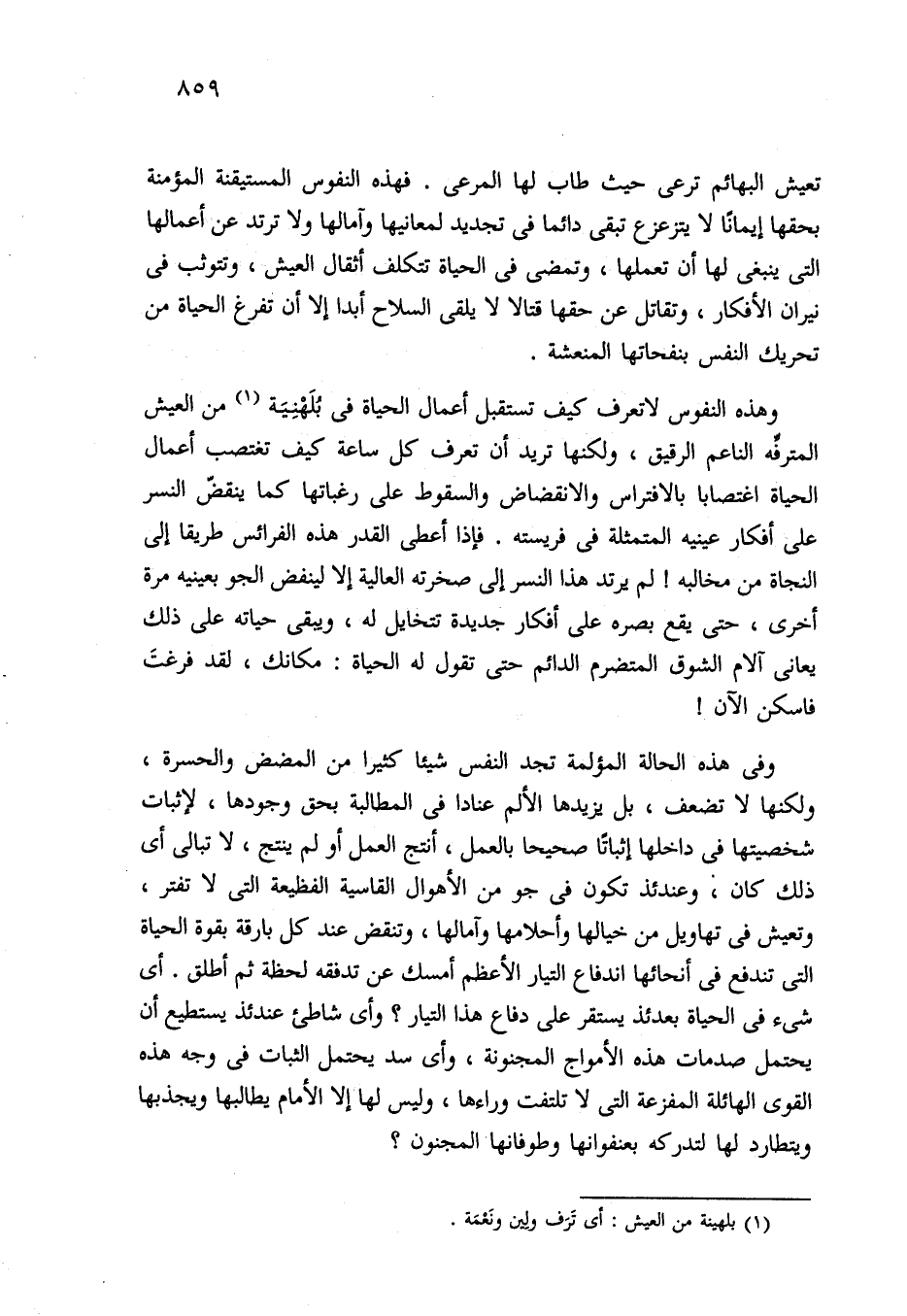 تعيش البهائم ترعى حيث طاب لها المرعى. فهذه النفوس المستيقنة المؤمنة بحقها إيمانًا لا يتزعزع تبقى دائما في تجديد لمعانيها وآمالها ولا ترتد عن أعمالها التي ينبغي لها أن تعملها، وتمضي في الحياة تتكلف أثقال العيش، وتتوثب في نيران الأفكار، وتقاتل عن حقها قتالا لا يلقي السلاح أبدا إلا أن تفرغ الحياة من تحريك النفس بنفحاتها المنعشة.