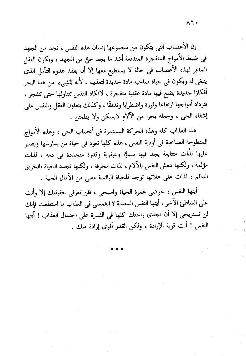 إن الأعصاب التي يتكون من مجموعها إنسان هذه النفس، تجد من الجهد في ضبط الأمواج المنفجرة المتدفعة أشد ما يجد حيٌّ من الجهد، ويكون العقل المدبر لهذه الأعصاب في حالة لا يستطيع معها إلا أن يفقد هدوء التأمل الذي ينبغي له ويكون في حياة صاحبه مادة جديدة لتعذيبه، لأنه يُنْشِئ من هذا البحر أفكارًا جديدة يضع فيها مادة عقلية متفجرة، لا تكاد النفس تتناولها حتى تنفجر، فتزداد أمواجها ارتفاعا وثورة واضطرابا وتدفقًا، وكذلك يتعاون العقل والنفس على إشقاء الحي، وجعله بحرا من الآلام لا يسكن ولا يطمئن.