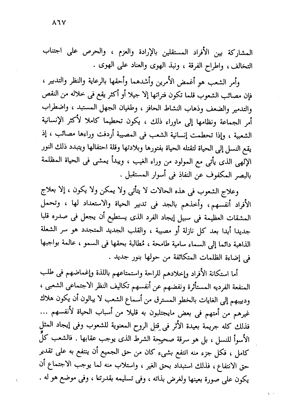 أما استكانة الأفراد وإخلادهم للراحة واستمتاعهم باللذة وإغماضهم في طلب المنفعة الفرديه المستأثرة ونفضهم عن أنفسهم تكاليف النظر الاجتماعي الشعبى، ودبيبهم إلى الغايات بالخطو المسترق من أسماع الشعب لا يبالون أن يكون هلاك غيرهم من أمتهم في بعض ما يجتلبون به قليلا من أسباب الحياة لأنفسهم. . . فذلك كله جريمة بعيدة الأثر في قتل الروح المعنوية للشعوب وفي إيجاد المثل الأسوأ للنسل، بل هو سرقة صحيحة الشرط الذي يوجب عقابها. فالشعب كلٌّ كامل، فكل جزء منه انتفع بشيء كان من حق الجميع أن ينتفع به على تقدير حق الانتفاع، فذلك استبداد بحق الغير، واستلاب منه لما يوجب الاجتماع أن يكون على صورة بعينها ولغرض بذاته، وفي تسليمه بقدرتنا، وفي موضع هو له.